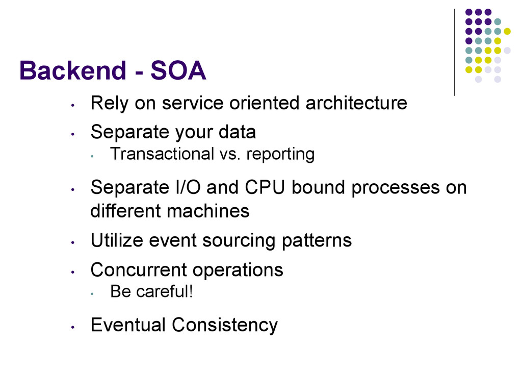 Separate your data • Transactional vs. reporting • Separate I/O and CPU bound processes on different machines • Utilize event sourcing patterns • Concurrent operations • Be careful! • Eventual Consistency