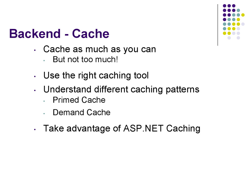 • But not too much! • Use the right caching tool • Understand different caching patterns • Primed Cache • Demand Cache • Take advantage of ASP.NET Caching