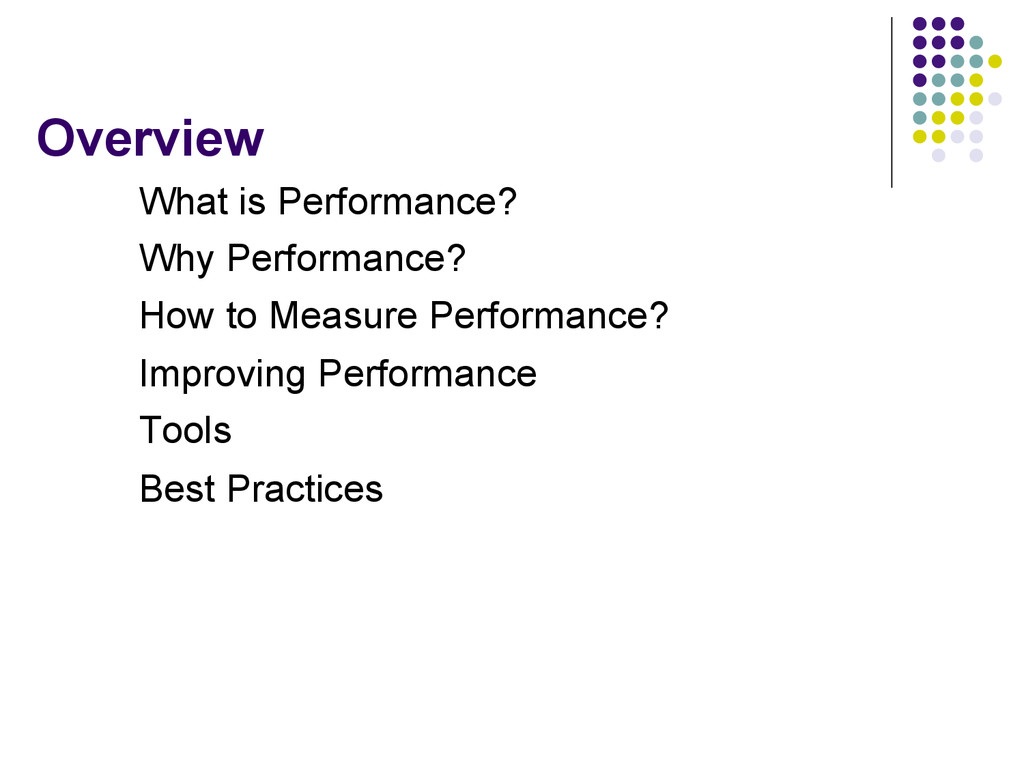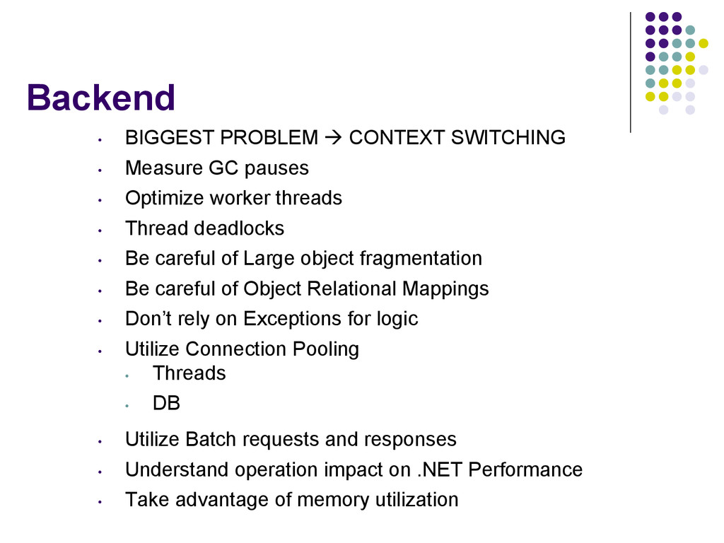 pauses • Optimize worker threads • Thread deadlocks • Be careful of Large object fragmentation • Be careful of Object Relational Mappings • Don’t rely on Exceptions for logic • Utilize Connection Pooling • Threads • DB • Utilize Batch requests and responses • Understand operation impact on .NET Performance • Take advantage of memory utilization