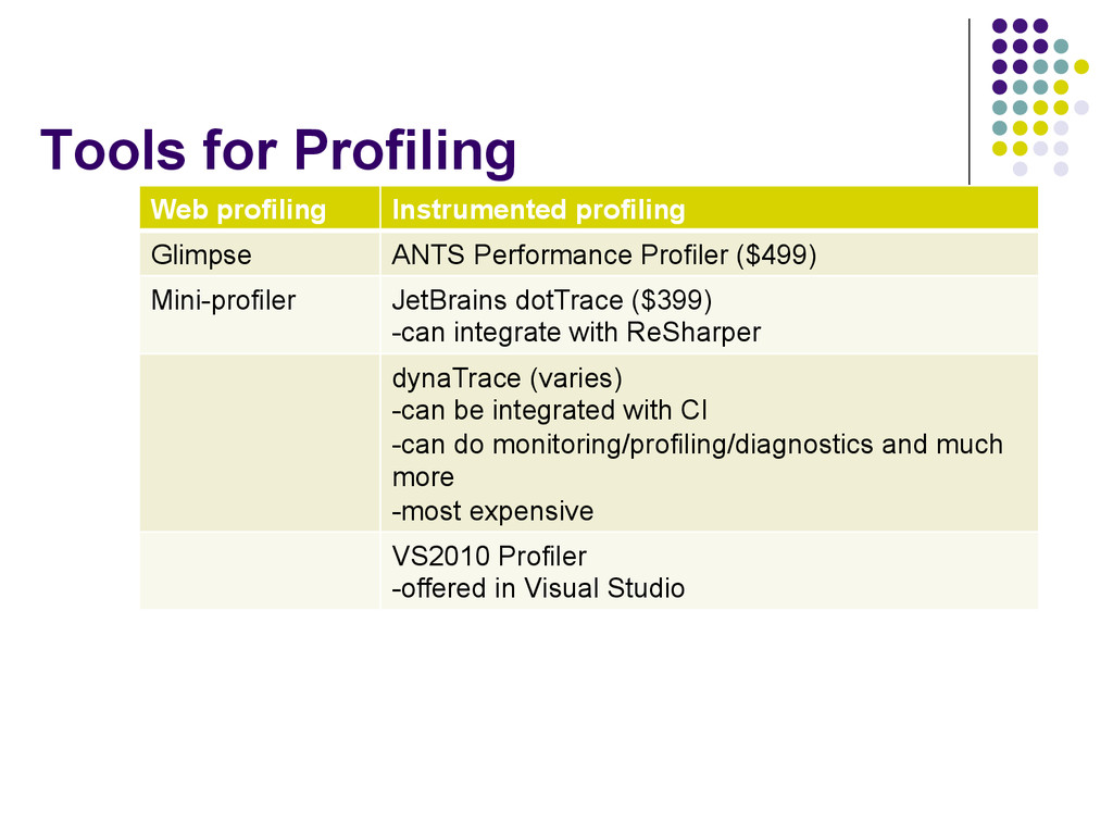 Profiler ($499) Mini-profiler JetBrains dotTrace ($399) -can integrate with ReSharper dynaTrace (varies) -can be integrated with CI -can do monitoring/profiling/diagnostics and much more -most expensive VS2010 Profiler -offered in Visual Studio