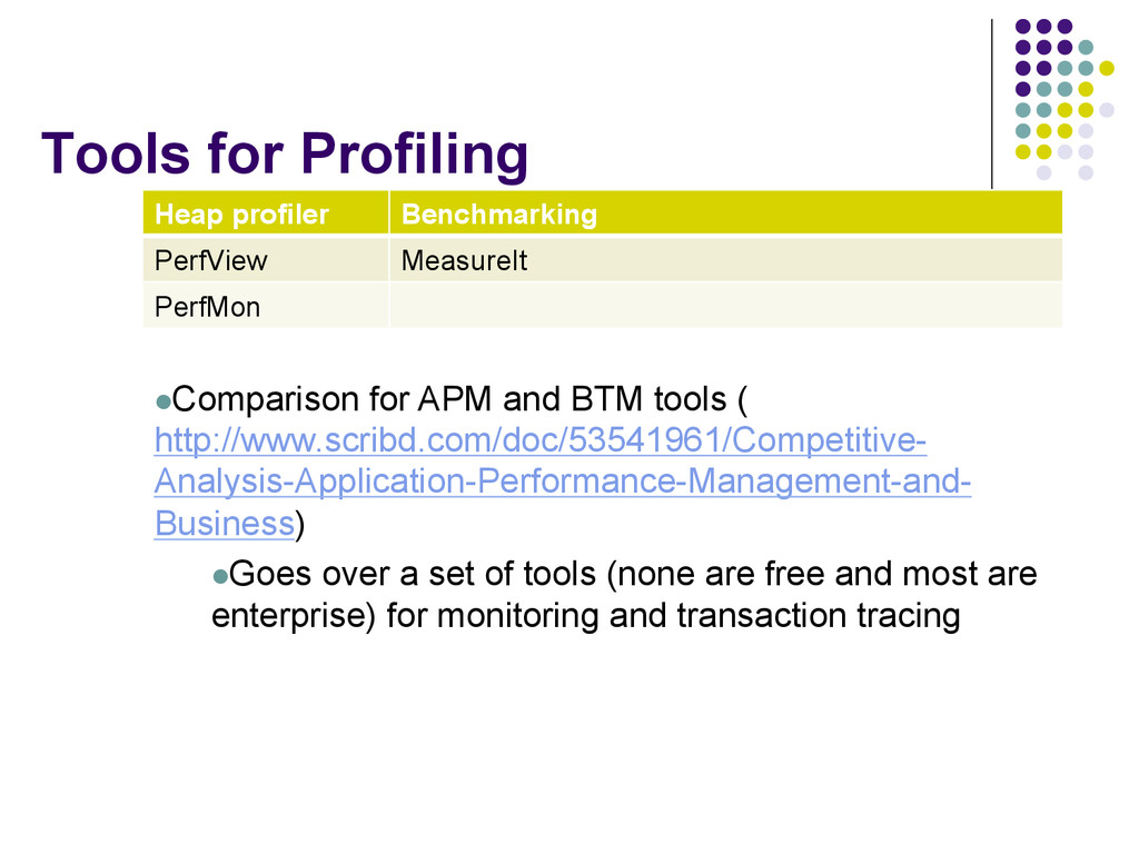 for APM and BTM tools ( http://www.scribd.com/doc/53541961/Competitive- Analysis-Application-Performance-Management-and- Business) l Goes over a set of tools (none are free and most are enterprise) for monitoring and transaction tracing