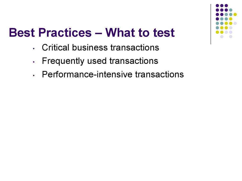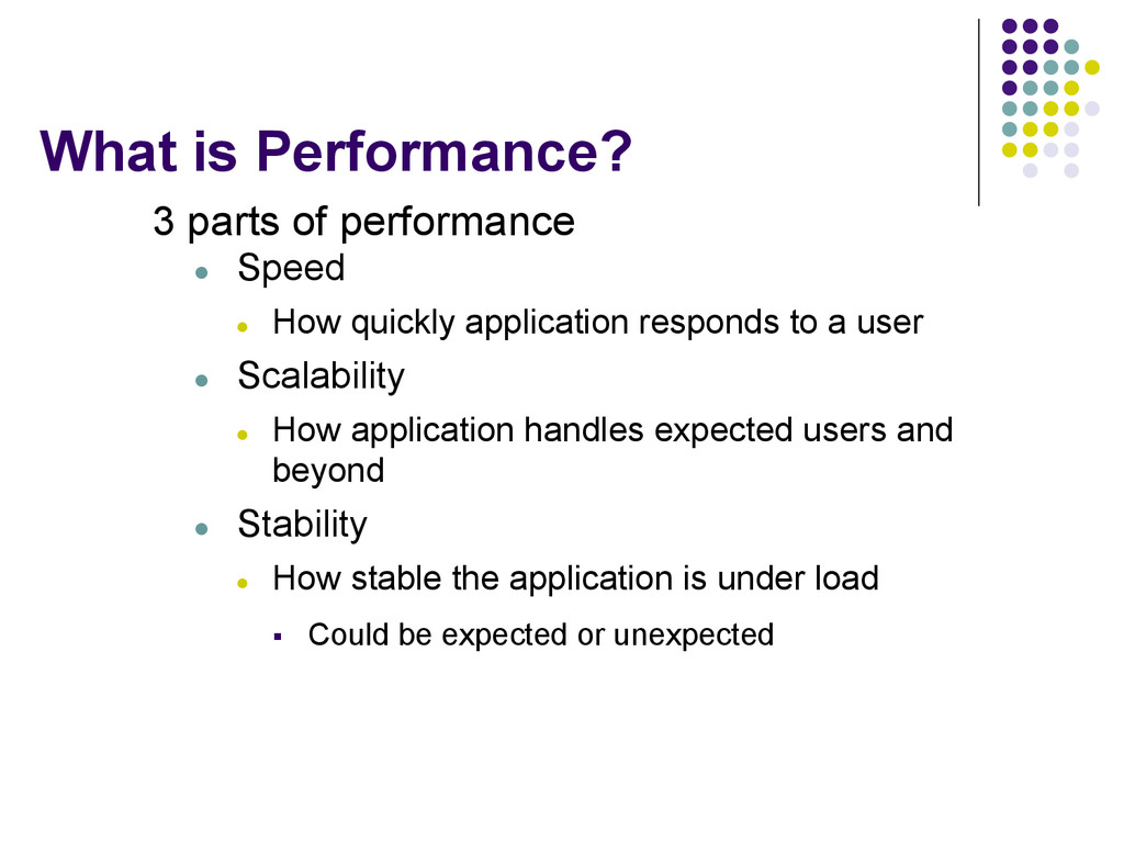 How quickly application responds to a user l Scalability l How application handles expected users and beyond l Stability l How stable the application is under load § Could be expected or unexpected