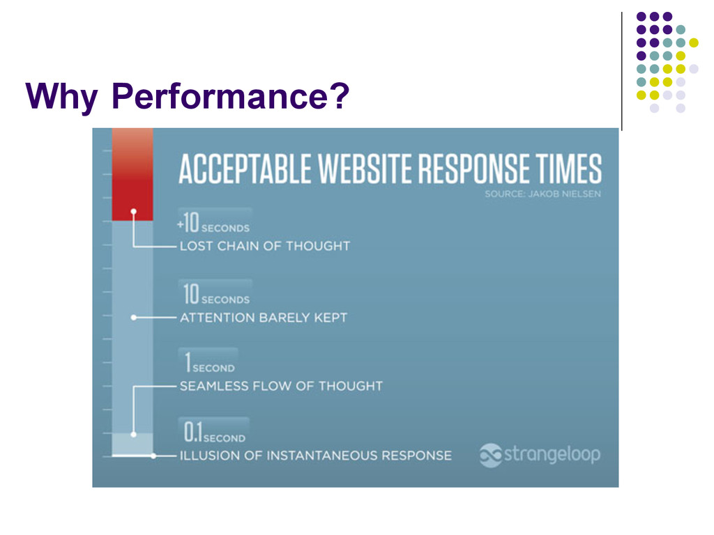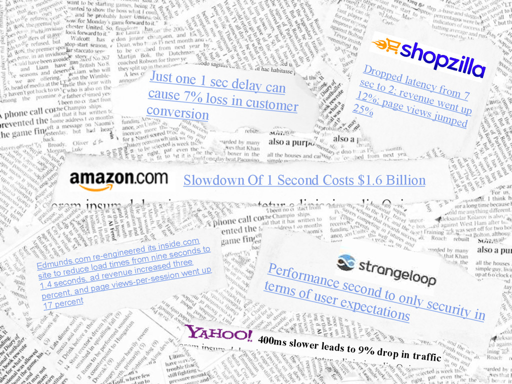 1 sec delay can cause 7% loss in customer conversion Dropped latency from 7 sec to 2; revenue went up 12%; page views jumped 25% Edmunds.com re-engineered its inside.com site to reduce load times from nine seconds to 1.4 seconds, ad revenue increased three percent, and page views-per-session went up 17 percent Slowdown Of 1 Second Costs $1.6 Billion Performance second to only security in terms of user expectations