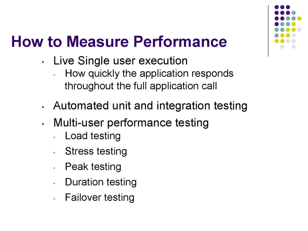 How quickly the application responds throughout the full application call • Automated unit and integration testing • Multi-user performance testing • Load testing • Stress testing • Peak testing • Duration testing • Failover testing