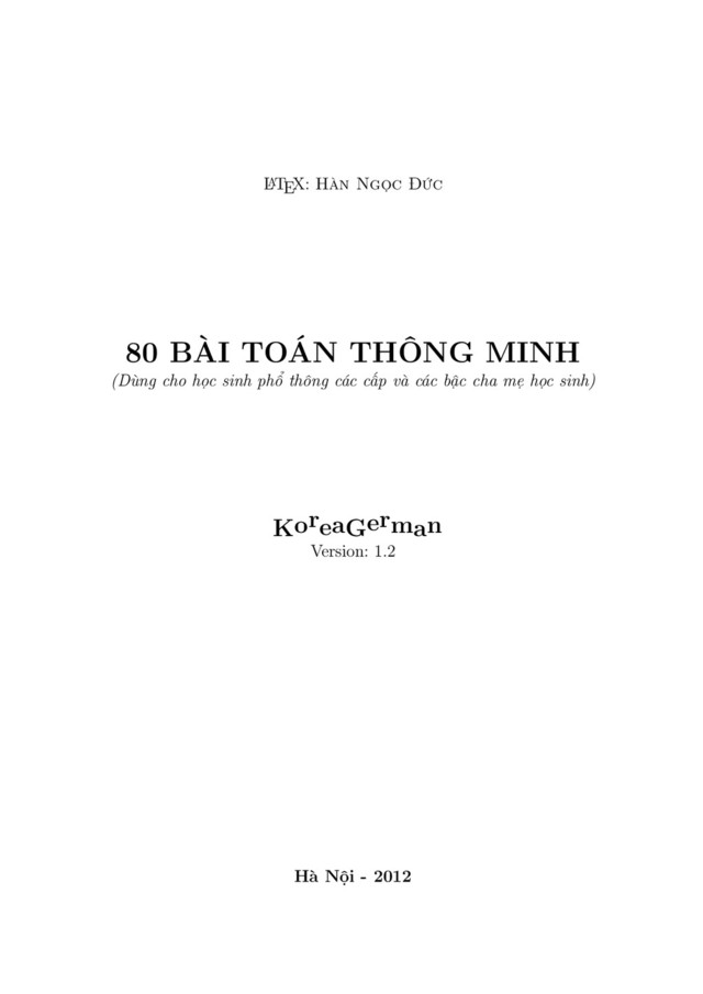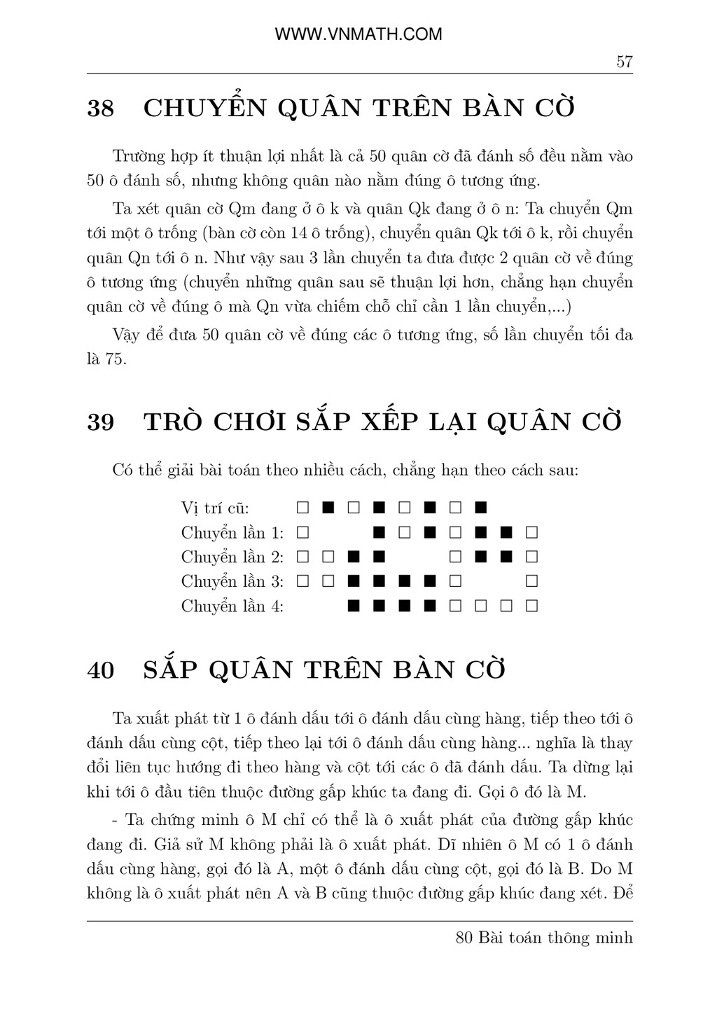 Vàng, Trắng, Xanh ở các ô tương ứng là 1, 2, 3, 4. Ta nhận thấy: Các ngôi sao khi dịch chuyển chỉ có thể theo cùng một hướng (ngược hay cùng chiều kim đồng hồ) nếu không ngôi sao này sẽ chặn đường các ngôi sao khác. Vậy có các khả năng sau: - Đỏ tới ô 4, Xanh tới ô 2, Vàng tới ô 3, Trắng tới ô 1 và thứ tự mới của chúng là : Trắng, Xanh, Vàng, đỏ. - Đỏ tới ô 2, Xanh tới ô 3, Vàng tới ô 1, Trắng tới ô 4 và thứ tự mới của chúng là: Vàng, Đỏ, Xanh, Trắng. - Đỏ tới ô 3, Trắng tới ô 2, Vàng tới ô 4, Xanh tới ô 1 và thứ tự mới của chúng là: Xanh, Trắng, Đỏ, Vàng. Vậy các ngôi sao khi chuyển dịch theo quy tắc bài toán có 3 khả năng sắp xếp lại thứ tự như trên. 43 MỘT CUỘC KÉO CO Kết quả bài toán: Xếp theo thứ tự từ khoẻ đến yếu là: Việt, Ba, An, Nam. Thật vậy: Ta biểu diễn hình thức sức của An, Ba, Nam, Việt tương ứng là a, b, n, v. Từ các điều kiện bài toán ta có: b > a, b > n(4) a + b = v + n(5) a + v > b + n(6) Từ (5) và (6) suy ra: a > n và v > b. Kết hợp với (4) suy ra kết quả như ở trên. 44 CÁC VẬN ĐỘNG VIÊN THỂ THAO Ký hiệu Aj là giải của vận động viên mang áo số j (j là 1, 2, 3 hoặc 4 và Aj cũng vậy). 80 Bài toán thông minh WWW.VNMATH.COM
