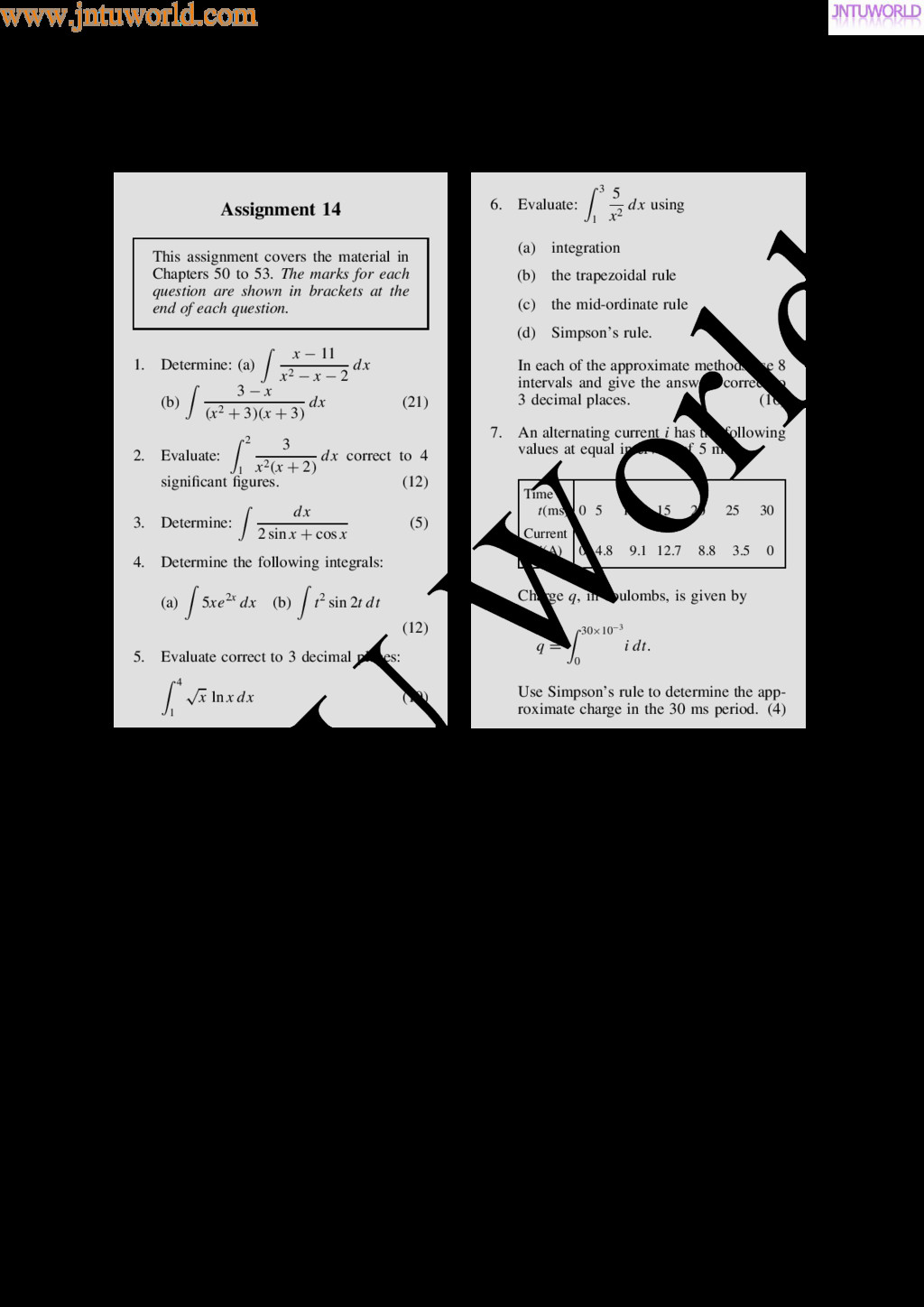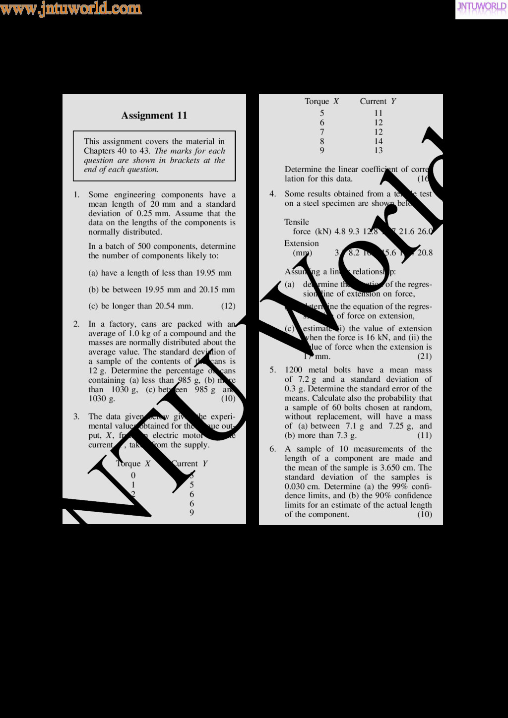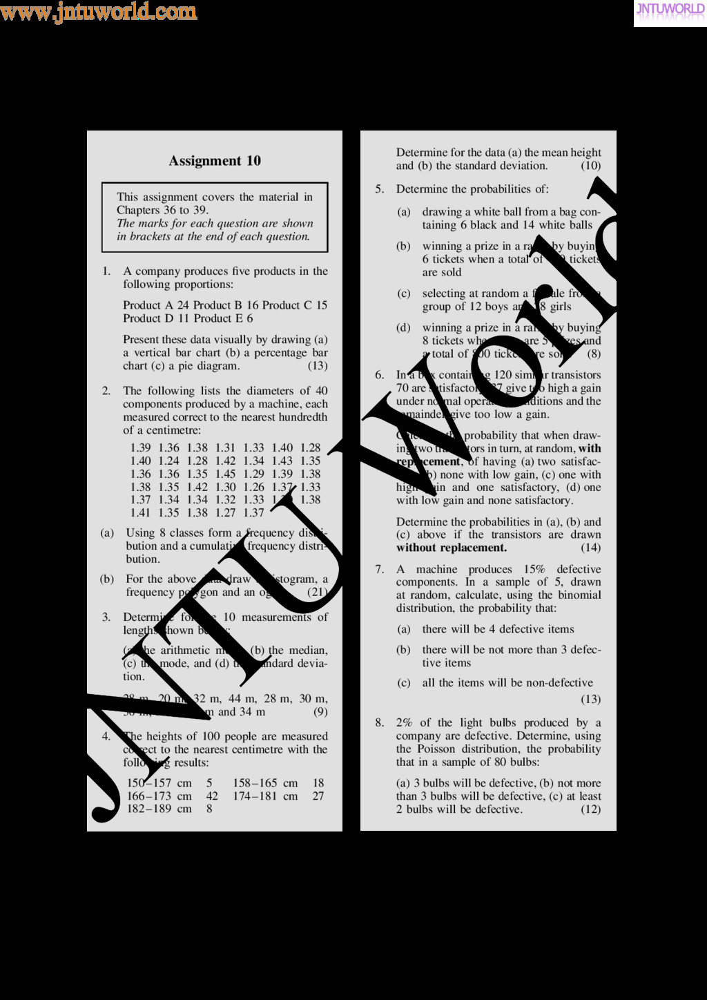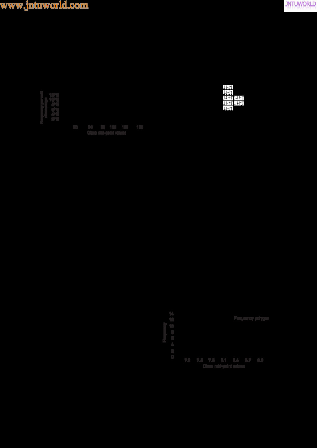 central tendency A single value, which is representative of a set of values, may be used to give an indication of the gen- eral size of the members in a set, the word ‘average’ often being used to indicate the single value. The statistical term used for ‘average’ is the arithmetic mean or just the mean. Other measures of central tendency may be used and these include the median and the modal values. 37.2 Mean, median and mode for discrete data Mean The arithmetic mean value is found by adding together the values of the members of a set and dividing by the number of members in the set. Thus, the mean of the set of numbers: f4, 5, 6, 9g is: 4 C 5 C 6 C 9 4 , i.e. 6 In general, the mean of the set: fx1, x2, x3, . . . , xn g is x D x1 C x2 C x3 C Ð Ð Ð C xn n , written as x n where is the Greek letter ‘sigma’ and means ‘the sum of’, and x (called x-bar) is used to signify a mean value. Median The median value often gives a better indication of the general size of a set containing extreme values. The set: f7, 5, 74, 10g has a mean value of 24, which is not really representative of any of the values of the members of the set. The median value is obtained by: (a) ranking the set in ascending order of magni- tude, and (b) selecting the value of the middle member for sets containing an odd number of members, or finding the value of the mean of the two middle members for sets containing an even number of members. For example, the set: f7, 5, 74, 10g is ranked as f5, 7, 10, 74g, and since it contains an even number of members (four in this case), the mean of 7 and 10 is taken, giving a median value of 8.5. Similarly, the set: f3, 81, 15, 7, 14g is ranked as f3, 7, 14, 15, 81g and the median value is the value of the middle member, i.e. 14. Mode The modal value, or mode, is the most commonly occurring value in a set. If two values occur with the same frequency, the set is ‘bi-modal’. The set: f5, 6, 8, 2, 5, 4, 6, 5, 3g has a modal value of 5, since the member having a value of 5 occurs three times. Problem 1. Determine the mean, median and mode for the set: f2, 3, 7, 5, 5, 13, 1, 7, 4, 8, 3, 4, 3g The mean value is obtained by adding together the values of the members of the set and dividing by the number of members in the set. Thus, mean value, x D 2 C 3 C 7 C 5 C 5 C 13 C 1 C7 C 4 C 8 C 3 C 4 C 3 13 D 65 13 D 5 To obtain the median value the set is ranked, that is, placed in ascending order of magnitude, and since the set contains an odd number of members the value of the middle member is the median value. Ranking the set gives: f1, 2, 3, 3, 3, 4, 4, 5, 5, 7, 7, 8, 13g www.jntuworld.com JN TU W orld