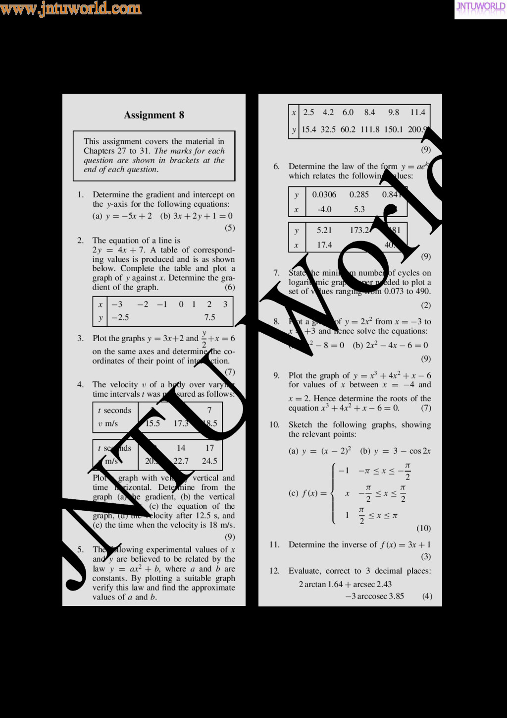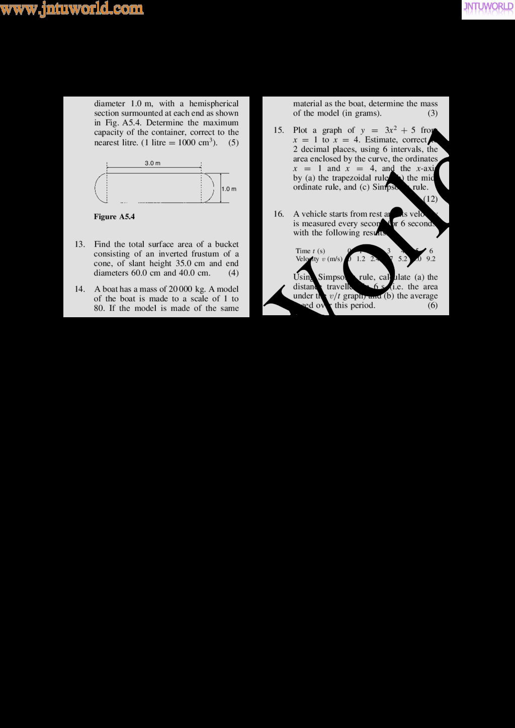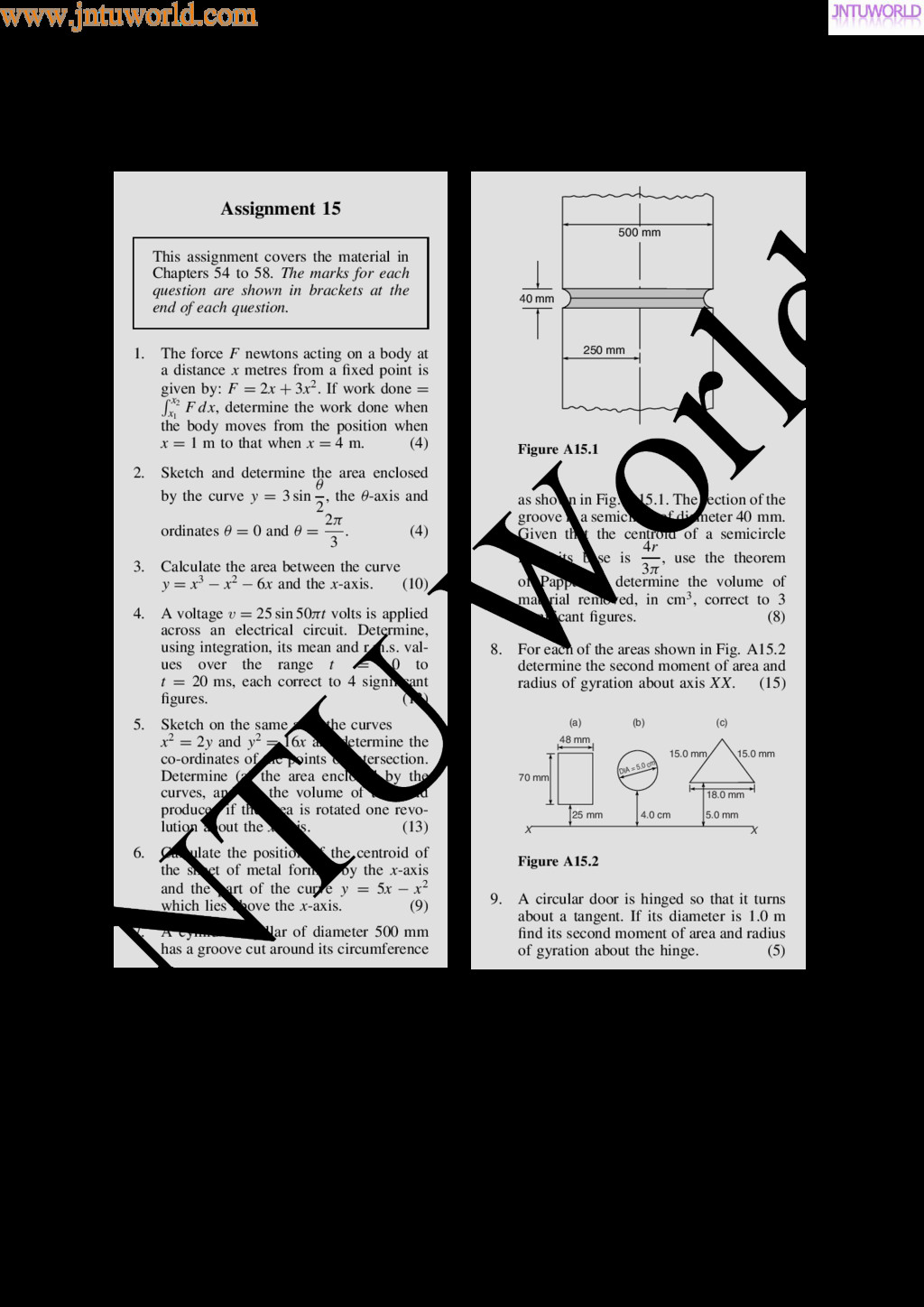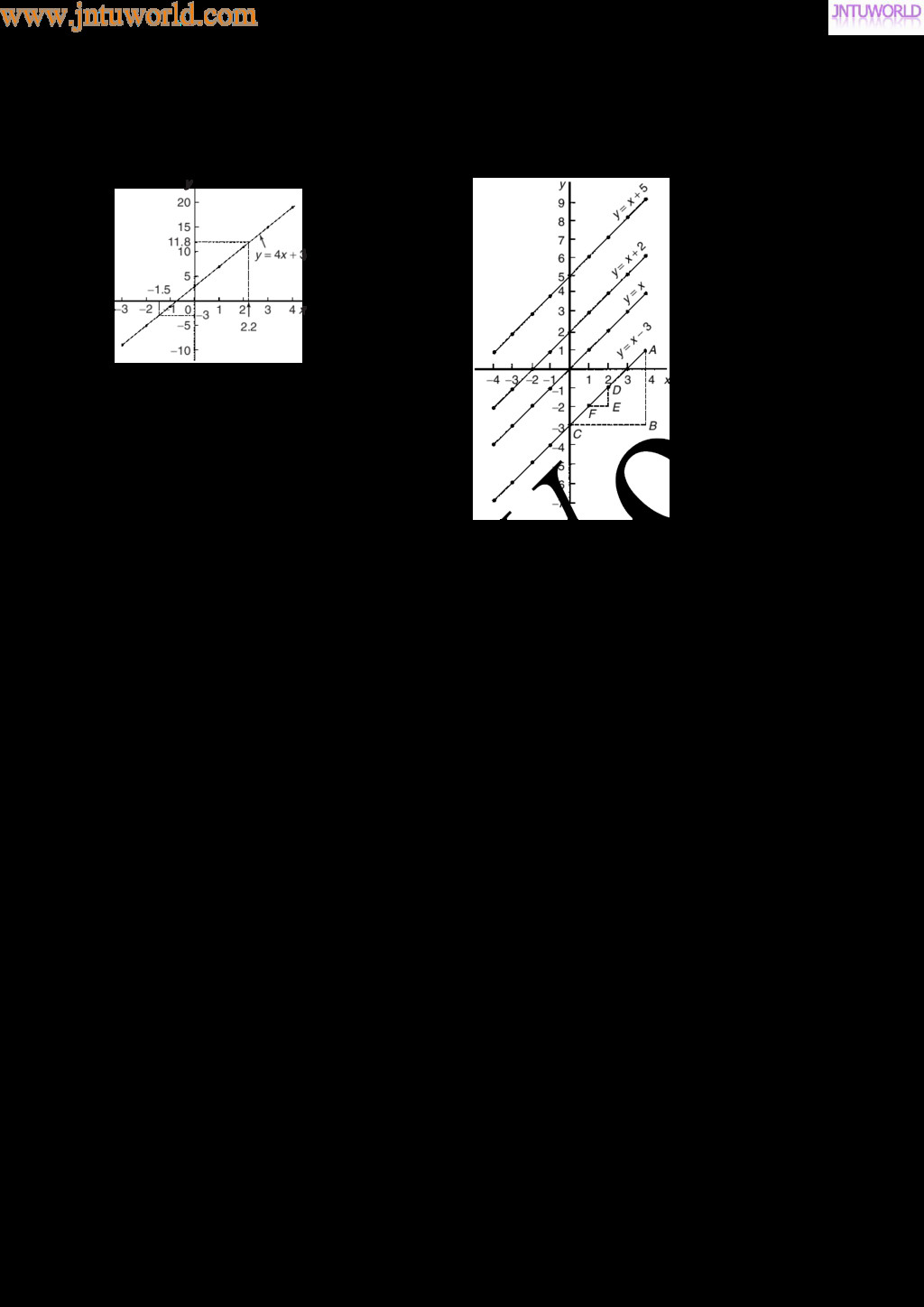 central tendency A single value, which is representative of a set of values, may be used to give an indication of the gen- eral size of the members in a set, the word ‘average’ often being used to indicate the single value. The statistical term used for ‘average’ is the arithmetic mean or just the mean. Other measures of central tendency may be used and these include the median and the modal values. 37.2 Mean, median and mode for discrete data Mean The arithmetic mean value is found by adding together the values of the members of a set and dividing by the number of members in the set. Thus, the mean of the set of numbers: f4, 5, 6, 9g is: 4 C 5 C 6 C 9 4 , i.e. 6 In general, the mean of the set: fx1, x2, x3, . . . , xn g is x D x1 C x2 C x3 C Ð Ð Ð C xn n , written as x n where is the Greek letter ‘sigma’ and means ‘the sum of’, and x (called x-bar) is used to signify a mean value. Median The median value often gives a better indication of the general size of a set containing extreme values. The set: f7, 5, 74, 10g has a mean value of 24, which is not really representative of any of the values of the members of the set. The median value is obtained by: (a) ranking the set in ascending order of magni- tude, and (b) selecting the value of the middle member for sets containing an odd number of members, or finding the value of the mean of the two middle members for sets containing an even number of members. For example, the set: f7, 5, 74, 10g is ranked as f5, 7, 10, 74g, and since it contains an even number of members (four in this case), the mean of 7 and 10 is taken, giving a median value of 8.5. Similarly, the set: f3, 81, 15, 7, 14g is ranked as f3, 7, 14, 15, 81g and the median value is the value of the middle member, i.e. 14. Mode The modal value, or mode, is the most commonly occurring value in a set. If two values occur with the same frequency, the set is ‘bi-modal’. The set: f5, 6, 8, 2, 5, 4, 6, 5, 3g has a modal value of 5, since the member having a value of 5 occurs three times. Problem 1. Determine the mean, median and mode for the set: f2, 3, 7, 5, 5, 13, 1, 7, 4, 8, 3, 4, 3g The mean value is obtained by adding together the values of the members of the set and dividing by the number of members in the set. Thus, mean value, x D 2 C 3 C 7 C 5 C 5 C 13 C 1 C7 C 4 C 8 C 3 C 4 C 3 13 D 65 13 D 5 To obtain the median value the set is ranked, that is, placed in ascending order of magnitude, and since the set contains an odd number of members the value of the middle member is the median value. Ranking the set gives: f1, 2, 3, 3, 3, 4, 4, 5, 5, 7, 7, 8, 13g www.jntuworld.com JN TU W orld