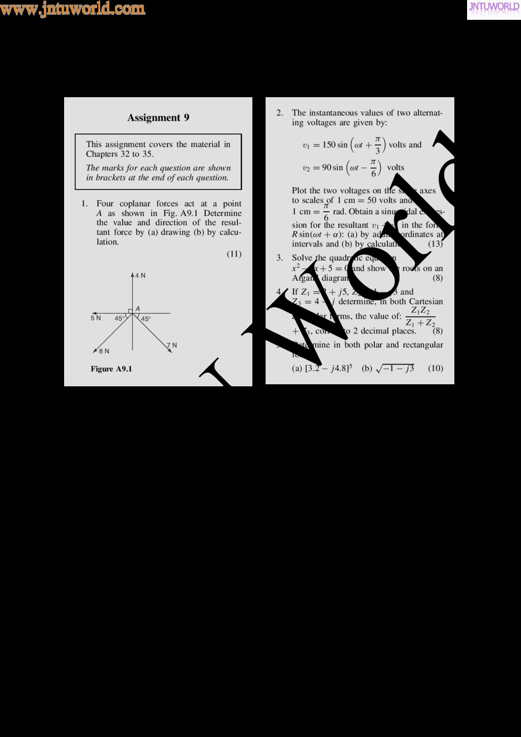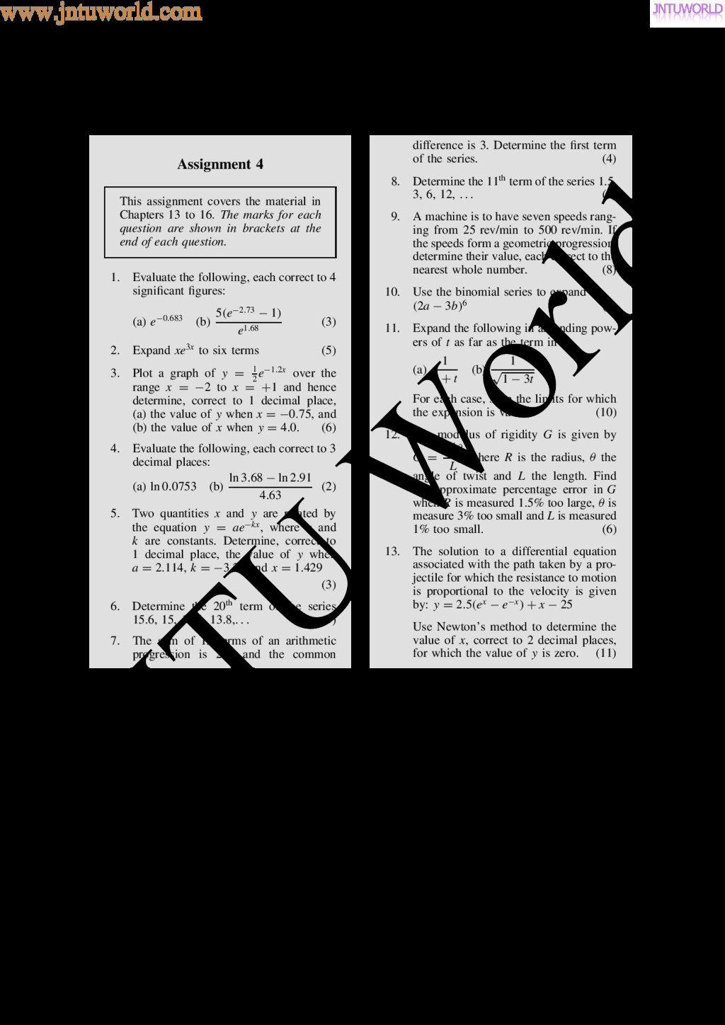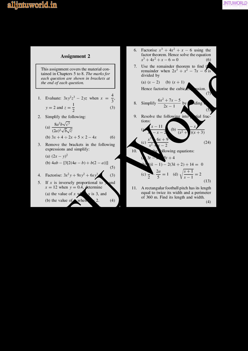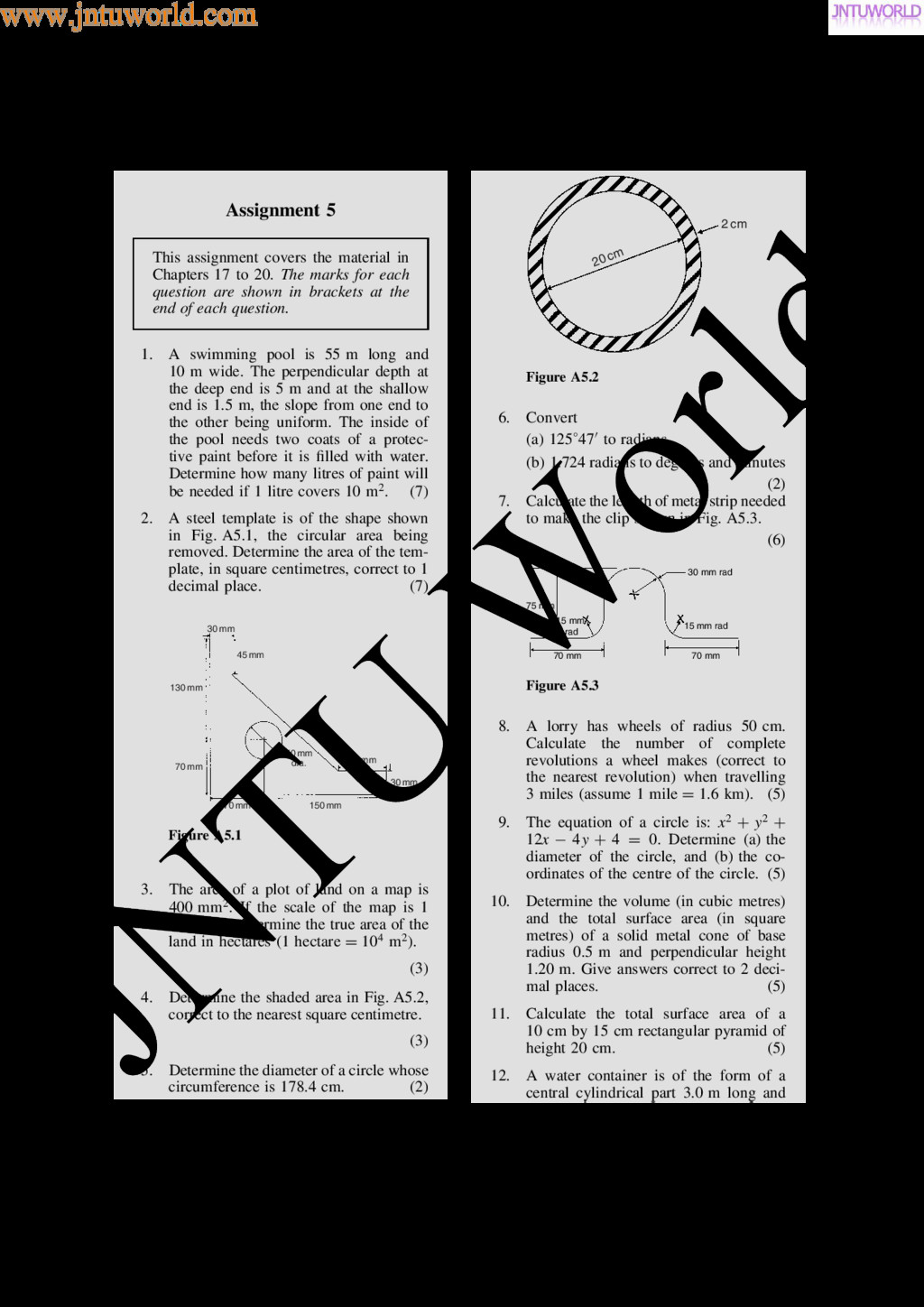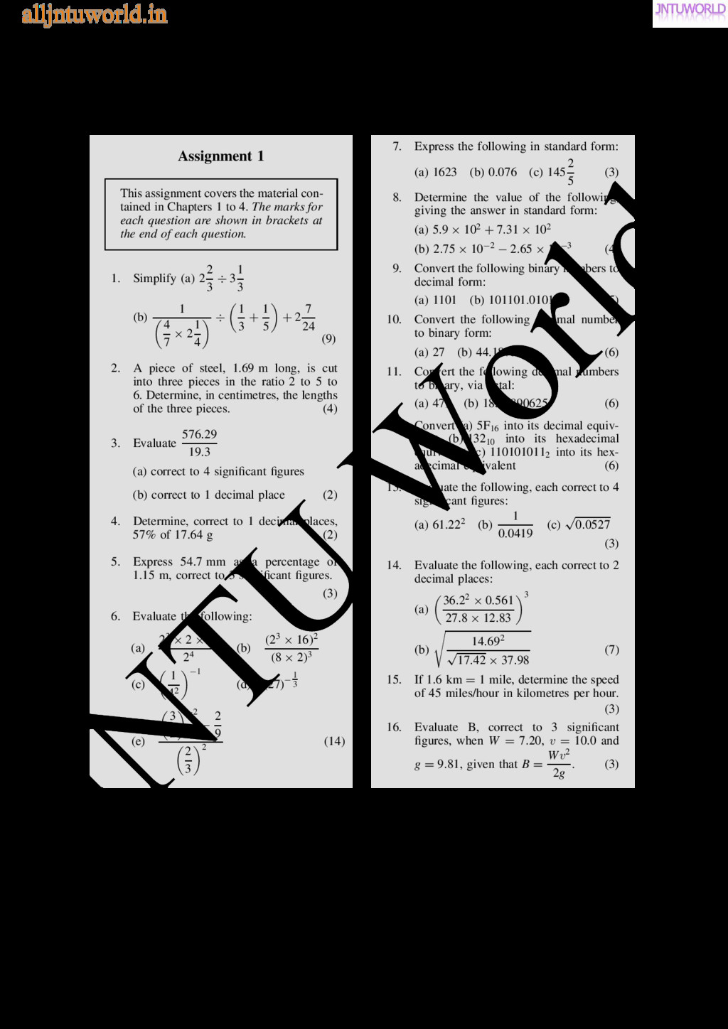 central tendency A single value, which is representative of a set of values, may be used to give an indication of the gen- eral size of the members in a set, the word ‘average’ often being used to indicate the single value. The statistical term used for ‘average’ is the arithmetic mean or just the mean. Other measures of central tendency may be used and these include the median and the modal values. 37.2 Mean, median and mode for discrete data Mean The arithmetic mean value is found by adding together the values of the members of a set and dividing by the number of members in the set. Thus, the mean of the set of numbers: f4, 5, 6, 9g is: 4 C 5 C 6 C 9 4 , i.e. 6 In general, the mean of the set: fx1, x2, x3, . . . , xn g is x D x1 C x2 C x3 C Ð Ð Ð C xn n , written as x n where is the Greek letter ‘sigma’ and means ‘the sum of’, and x (called x-bar) is used to signify a mean value. Median The median value often gives a better indication of the general size of a set containing extreme values. The set: f7, 5, 74, 10g has a mean value of 24, which is not really representative of any of the values of the members of the set. The median value is obtained by: (a) ranking the set in ascending order of magni- tude, and (b) selecting the value of the middle member for sets containing an odd number of members, or finding the value of the mean of the two middle members for sets containing an even number of members. For example, the set: f7, 5, 74, 10g is ranked as f5, 7, 10, 74g, and since it contains an even number of members (four in this case), the mean of 7 and 10 is taken, giving a median value of 8.5. Similarly, the set: f3, 81, 15, 7, 14g is ranked as f3, 7, 14, 15, 81g and the median value is the value of the middle member, i.e. 14. Mode The modal value, or mode, is the most commonly occurring value in a set. If two values occur with the same frequency, the set is ‘bi-modal’. The set: f5, 6, 8, 2, 5, 4, 6, 5, 3g has a modal value of 5, since the member having a value of 5 occurs three times. Problem 1. Determine the mean, median and mode for the set: f2, 3, 7, 5, 5, 13, 1, 7, 4, 8, 3, 4, 3g The mean value is obtained by adding together the values of the members of the set and dividing by the number of members in the set. Thus, mean value, x D 2 C 3 C 7 C 5 C 5 C 13 C 1 C7 C 4 C 8 C 3 C 4 C 3 13 D 65 13 D 5 To obtain the median value the set is ranked, that is, placed in ascending order of magnitude, and since the set contains an odd number of members the value of the middle member is the median value. Ranking the set gives: f1, 2, 3, 3, 3, 4, 4, 5, 5, 7, 7, 8, 13g www.jntuworld.com JN TU W orld