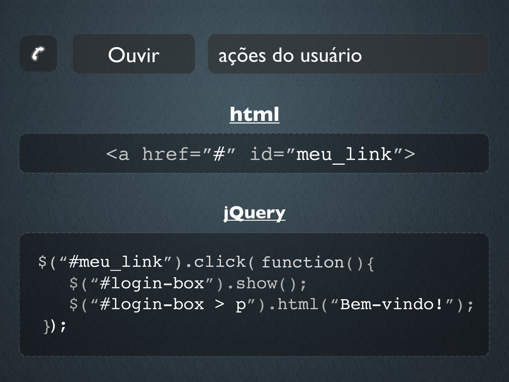 <a href=”#” id=”meu_link”> $(“#meu_link”).click( ); html jQuery Ouvir ações do