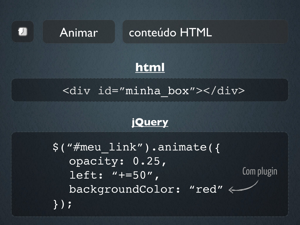 <div id=”minha_box”></div> $(“#meu_link”).animate({ }); html jQuery Animar conteúdo HTML opacity: