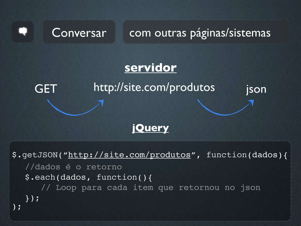 http://site.com/produtos $.getJSON(“http://site.com/produtos”, function(dados){ ); servidor jQuery Conversar com outras páginas/sistemas