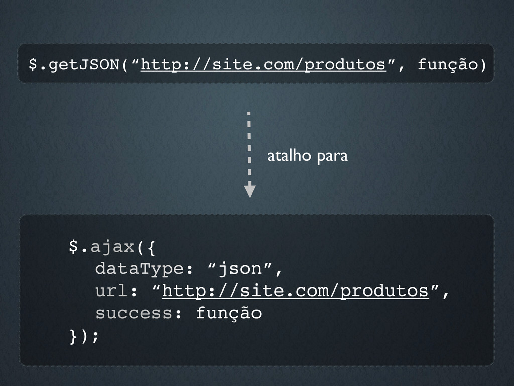 $.getJSON(“http://site.com/produtos”, função) atalho para $.ajax({ dataType: “json”, url: “http://site.com/produtos”, success: