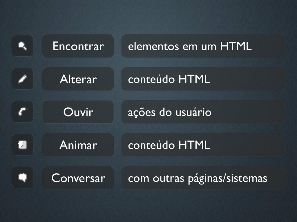 Encontrar elementos em um HTML Alterar conteúdo HTML Ouvir ações