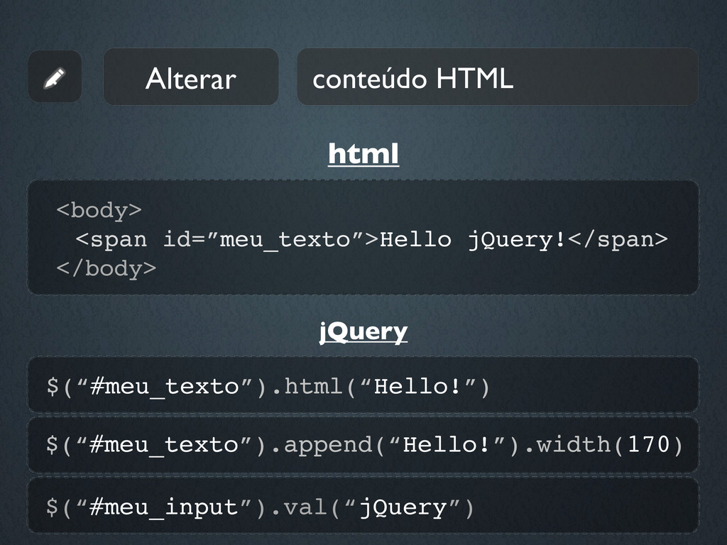 <body> <span id=”meu_texto”>Hello jQuery!</span> </body> $(“#meu_texto”).html(“Hello!”) $(“#meu_texto”).append(“Hello!”).width(170) html jQuery Alterar