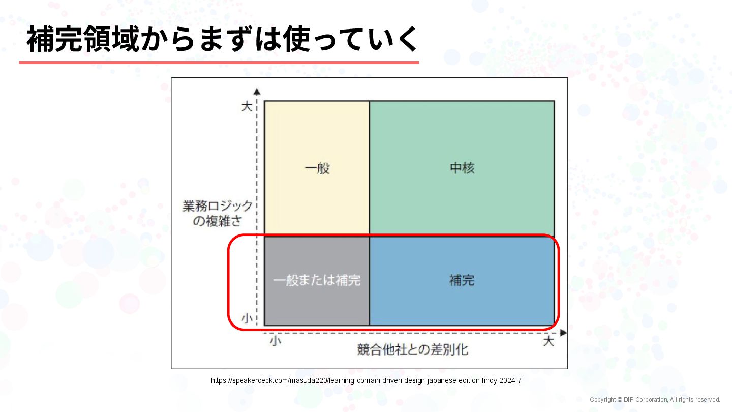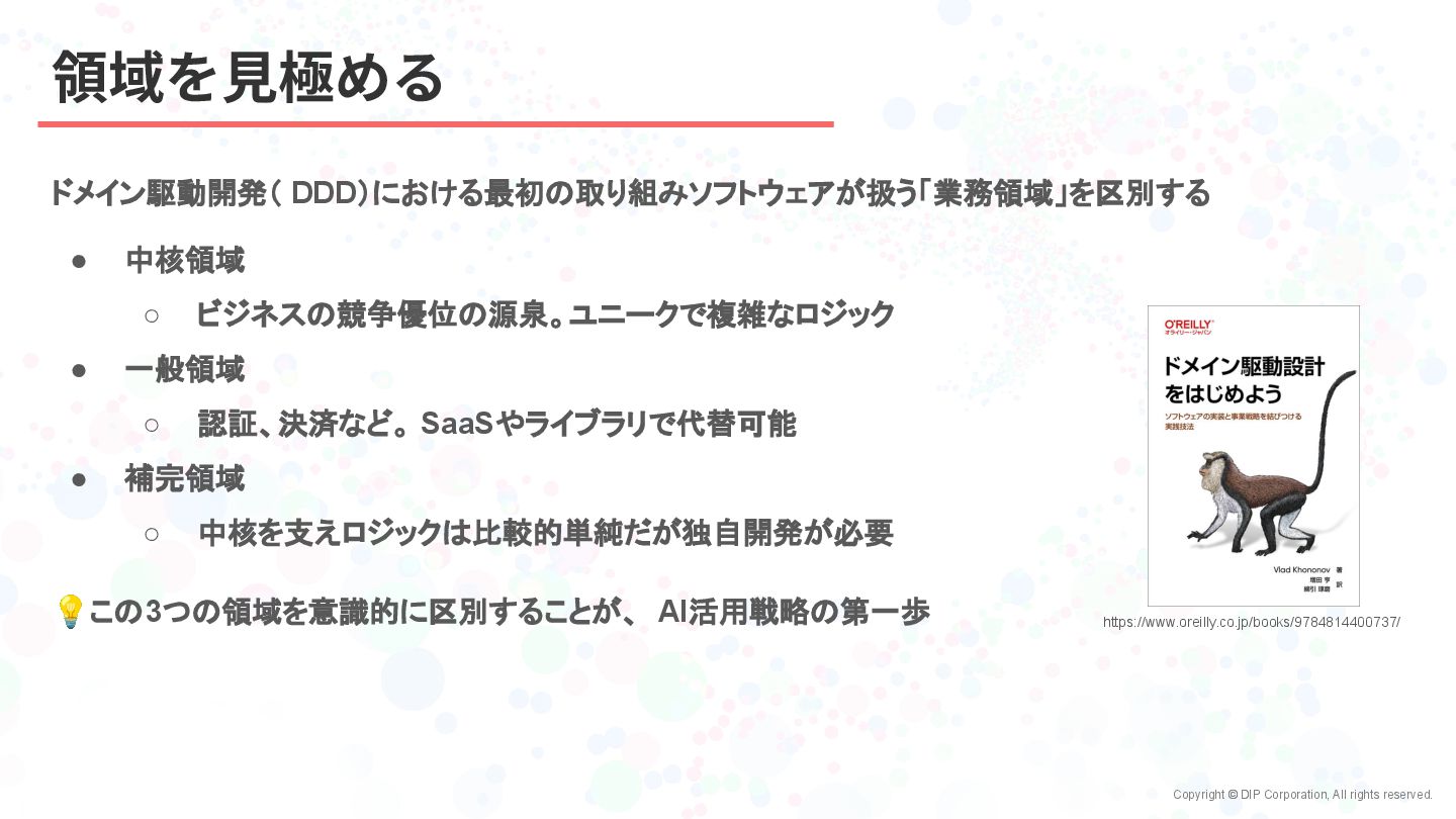 • 中核領域 ◦ ビジネスの競争優位の源泉。ユニークで複雑なロジック • 一般領域 ◦ 認証、決済など。 SaaSやライブラリで代替可能 • 補完領域 ◦ 中核を支えロジックは比較的単純だが独自開発が必要 💡この3つの領域を意識的に区別することが、 AI活用戦略の第一歩 https://www.oreilly.co.jp/books/9784814400737/
