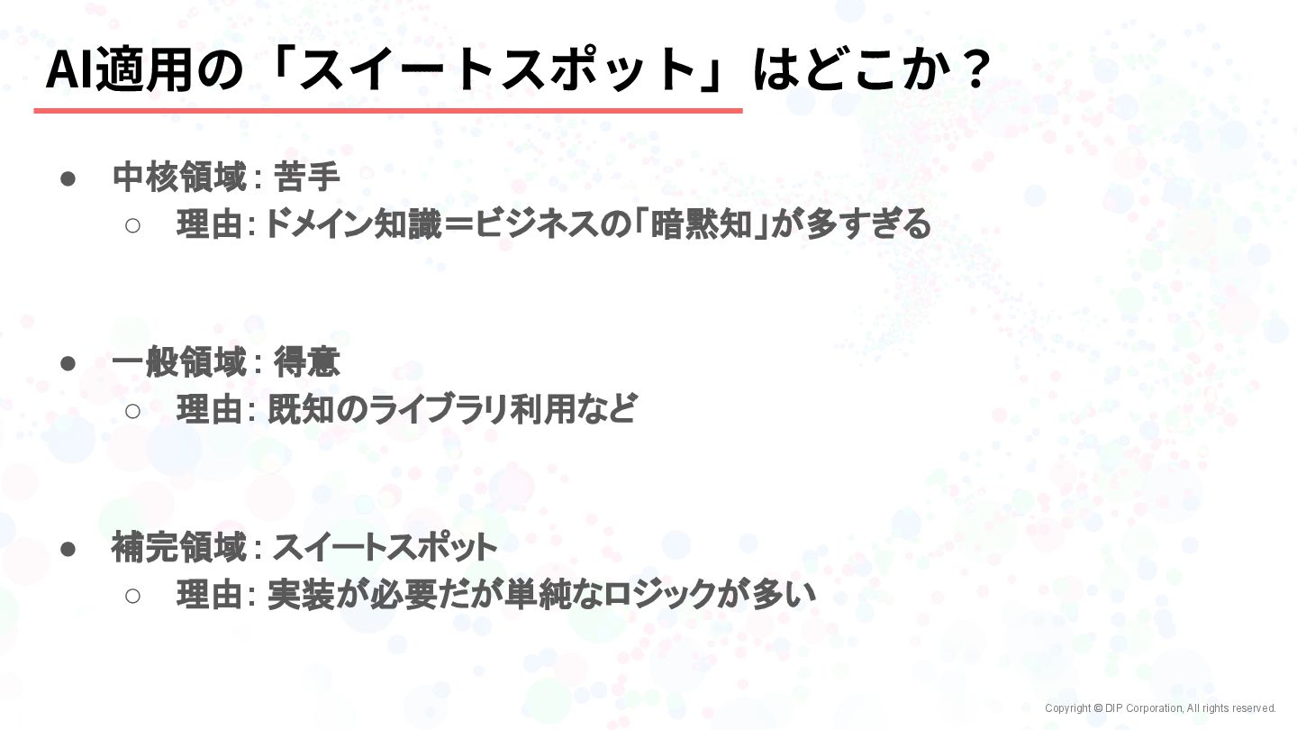 9. Copyright © DIP Corporation, All rights reserved. AI適⽤の「スイートスポット」はどこか? • 中核領域: