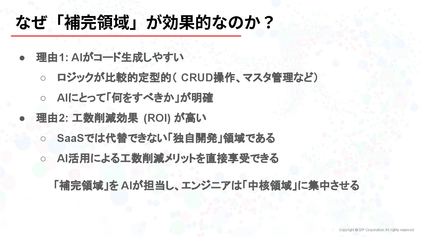 AIがコード生成しやすい ◦ ロジックが比較的定型的( CRUD操作、マスタ管理など) ◦ AIにとって「何をすべきか」が明確 • 理由2: 工数削減効果 (ROI) が高い ◦ SaaSでは代替できない「独自開発」領域である ◦ AI活用による工数削減メリットを直接享受できる 「補完領域」を AIが担当し、エンジニアは「中核領域」に集中させる