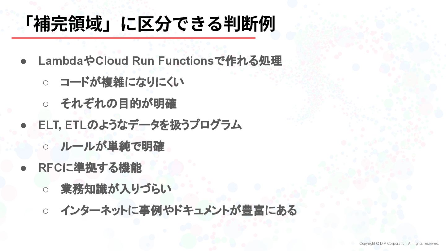 11. Copyright © DIP Corporation, All rights reserved. 「補完領域」に区分できる判断例 • LambdaやCloud