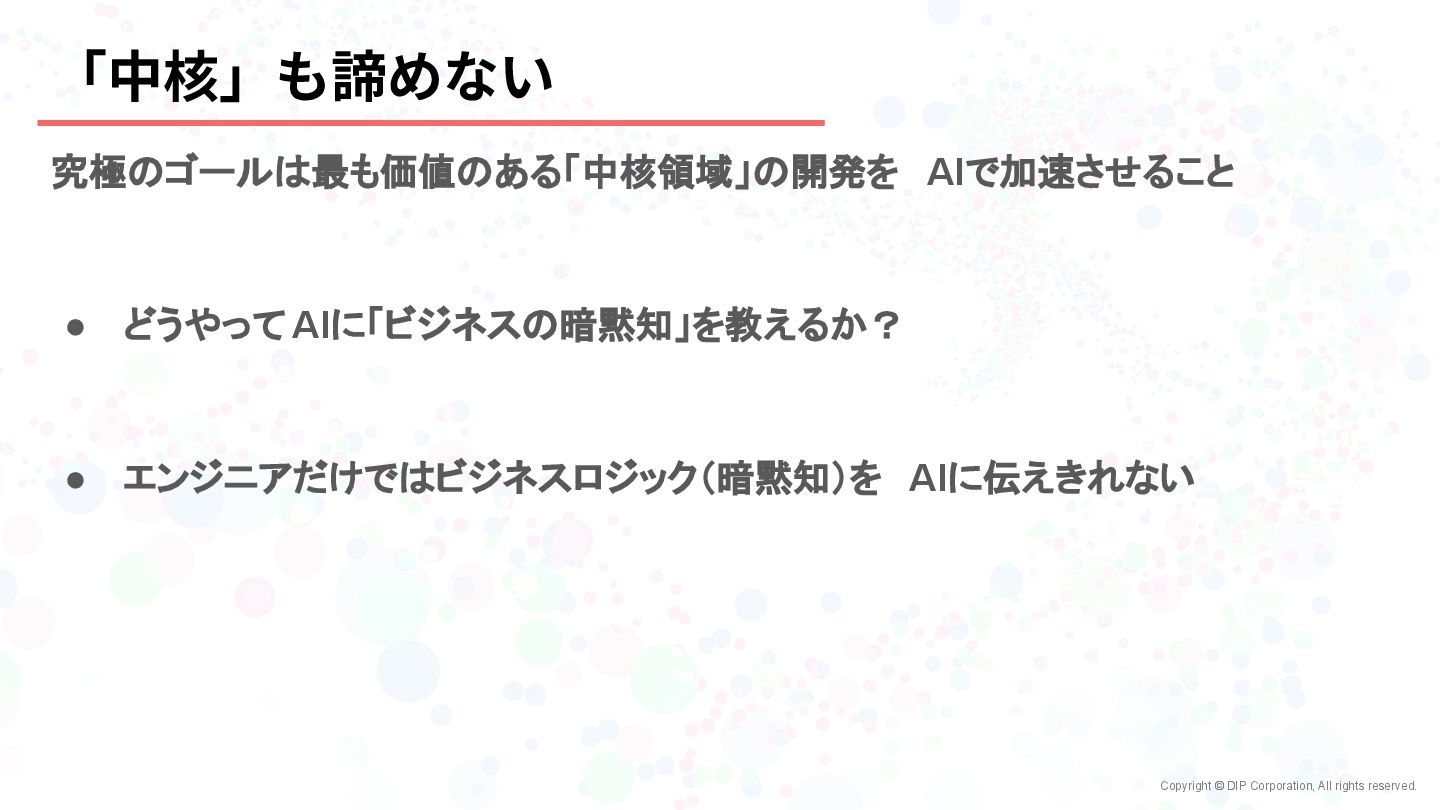 12. Copyright © DIP Corporation, All rights reserved. 「中核」も諦めない 究極のゴールは最も価値のある「中核領域」の開発を AIで加速させること