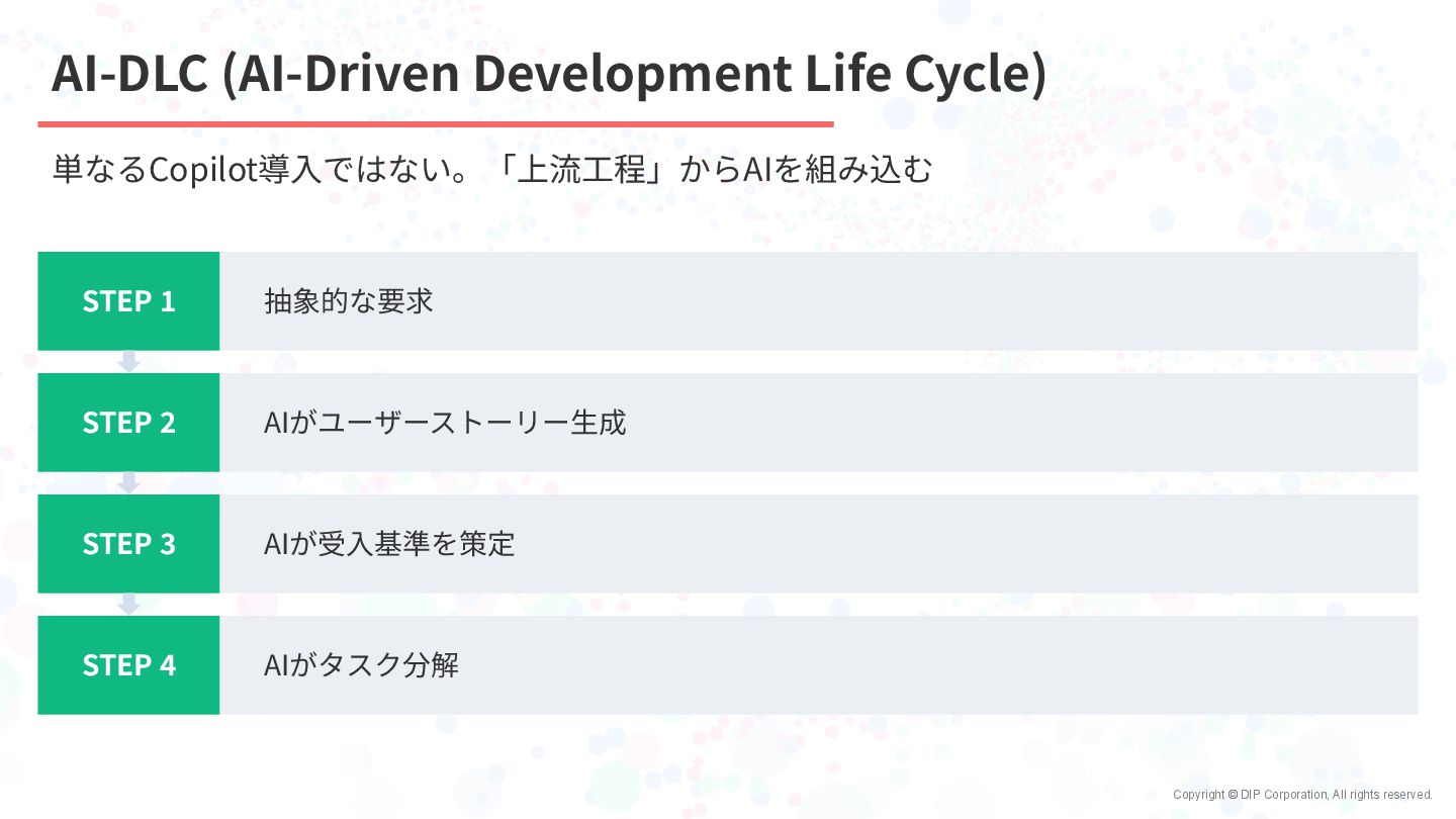 Life Cycle) 単なるCopilot導⼊ではない。「上流⼯程」からAIを組み込む STEP 1 抽象的な要求 STEP 2 AIがユーザーストーリー⽣成 STEP 3 AIが受⼊基準を策定 STEP 4 AIがタスク分解