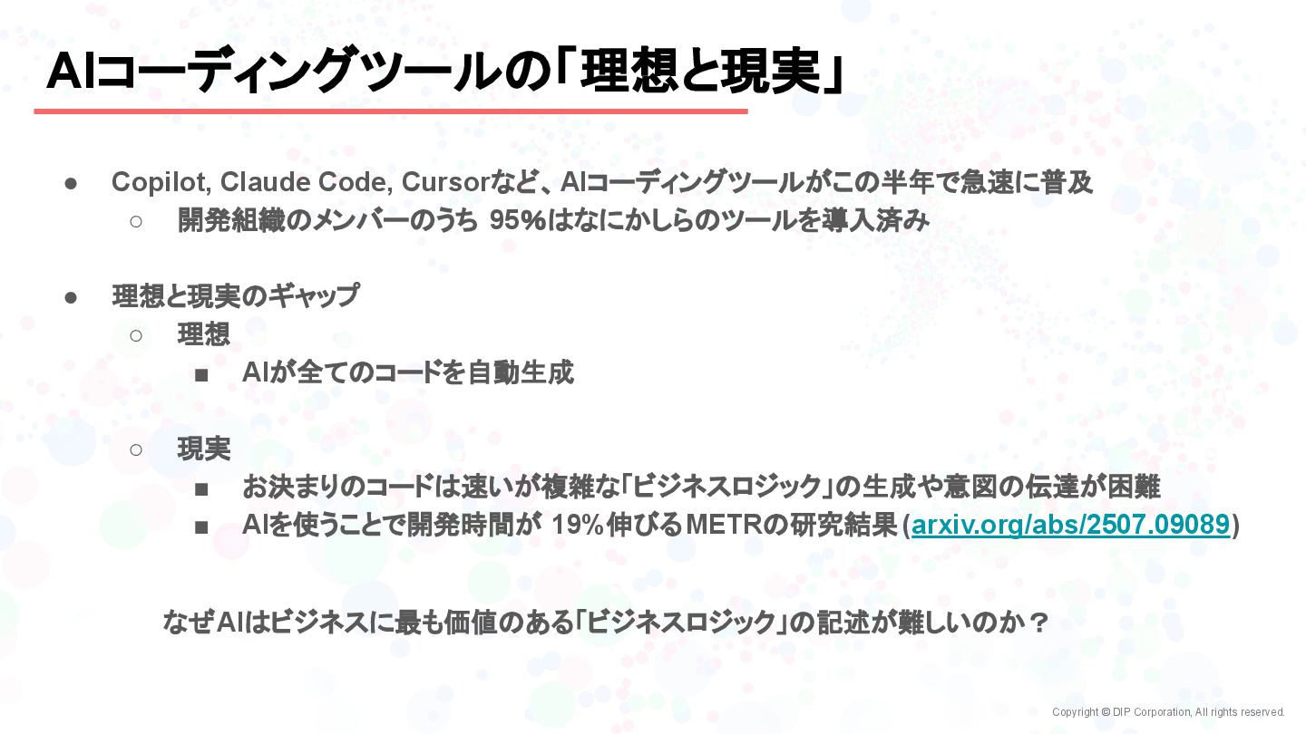 Claude Code, Cursorなど、AIコーディングツールがこの半年で急速に普及 ◦ 開発組織のメンバーのうち 95%はなにかしらのツールを導入済み • 理想と現実のギャップ ◦ 理想 ▪ AIが全てのコードを自動生成 ◦ 現実 ▪ お決まりのコードは速いが複雑な「ビジネスロジック」の生成や意図の伝達が困難 ▪ AIを使うことで開発時間が 19%伸びるMETRの研究結果 (arxiv.org/abs/2507.09089) なぜAIはビジネスに最も価値のある「ビジネスロジック」の記述が難しいのか?