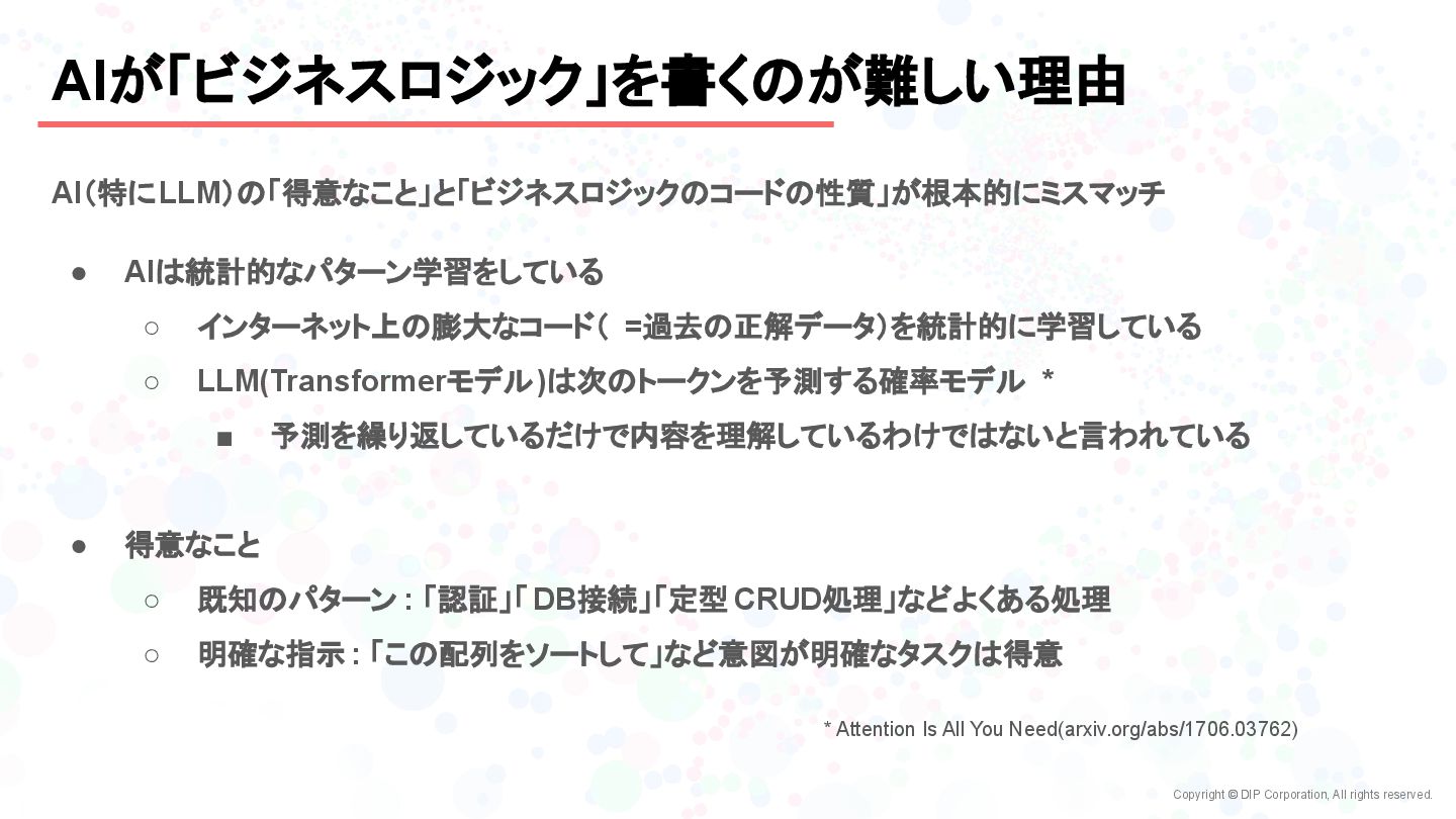 5. Copyright © DIP Corporation, All rights reserved. AIが「ビジネスロジック」を書くのが難しい理由 AI(特にLLM)の「得意なこと」と「ビジネスロジックのコードの性質」が根本的にミスマッチ •