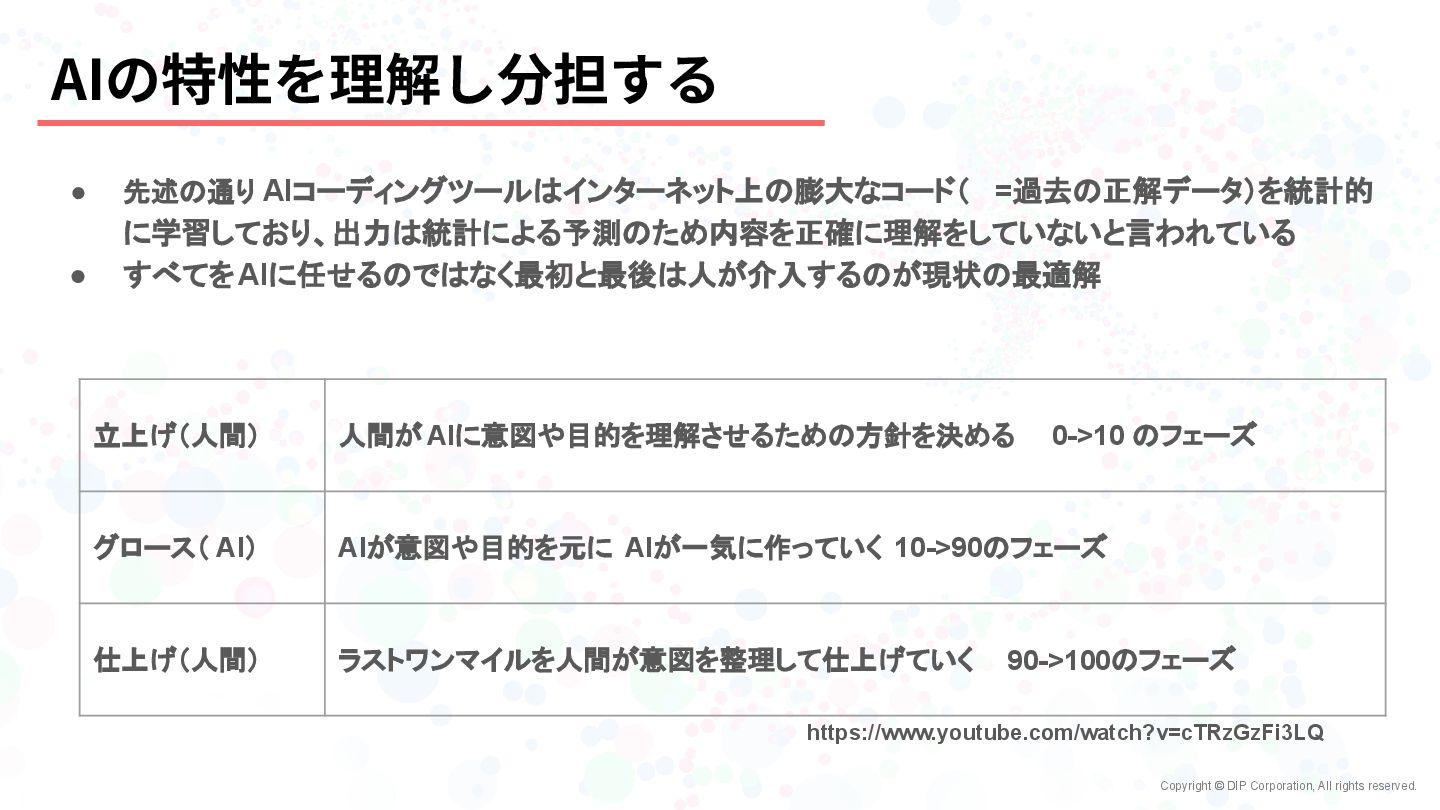 AIコーディングツールはインターネット上の膨大なコード( =過去の正解データ)を統計的 に学習しており、出力は統計による予測のため内容を正確に理解をしていないと言われている • すべてをAIに任せるのではなく最初と最後は人が介入するのが現状の最適解 立上げ(人間) 人間がAIに意図や目的を理解させるための方針を決める 0->10 のフェーズ グロース( AI) AIが意図や目的を元に AIが一気に作っていく 10->90のフェーズ 仕上げ(人間) ラストワンマイルを人間が意図を整理して仕上げていく 90->100のフェーズ https://www.youtube.com/watch?v=cTRzGzFi3LQ