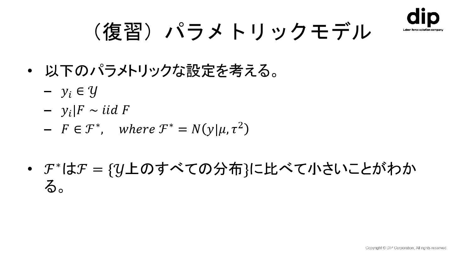 ∼ 𝑖𝑖𝑑 𝐹 – 𝐹 ∈ ℱ∗, 𝑤ℎ𝑒𝑟𝑒 ℱ∗ = 𝑁 𝑦|𝜇, 𝜏2 • ℱ∗はℱ = {𝒴上のすべての分布}に比べて小さいことがわか る。