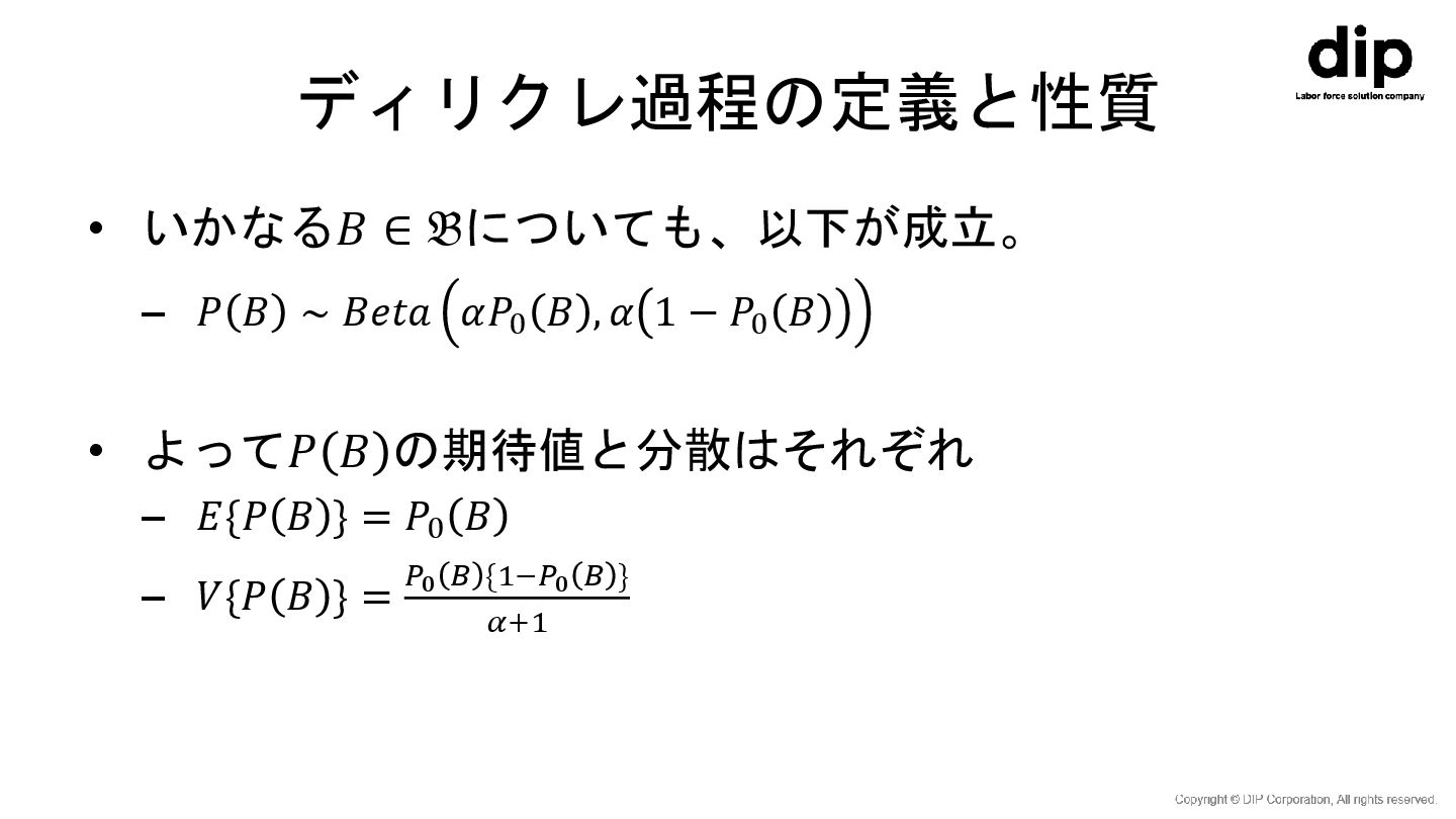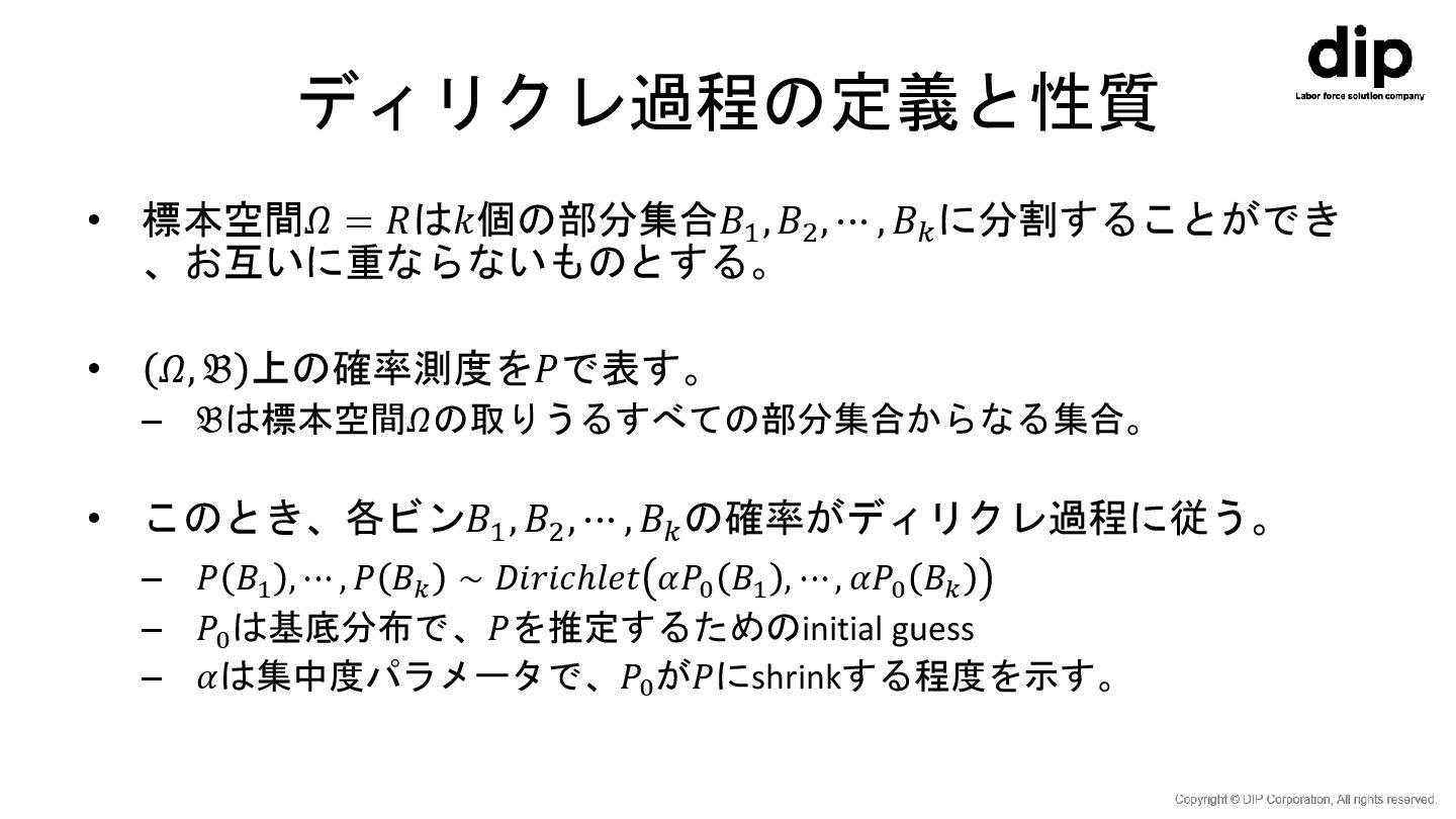 𝐵𝑘 に分割することができ 、お互いに重ならないものとする。 • 𝛺, 𝔅 上の確率測度を𝑃で表す。 – 𝔅は標本空間𝛺の取りうるすべての部分集合からなる集合。 • このとき、各ビン𝐵1 , 𝐵2 , ⋯ , 𝐵𝑘 の確率がディリクレ過程に従う。 – 𝑃 𝐵1 , ⋯ , 𝑃 𝐵𝑘 ∼ 𝐷𝑖𝑟𝑖𝑐ℎ𝑙𝑒𝑡 𝛼𝑃0 𝐵1 , ⋯ , 𝛼𝑃0 𝐵𝑘 – 𝑃0 は基底分布で、𝑃を推定するためのinitial guess – 𝛼は集中度パラメータで、𝑃0 が𝑃にshrinkする程度を示す。