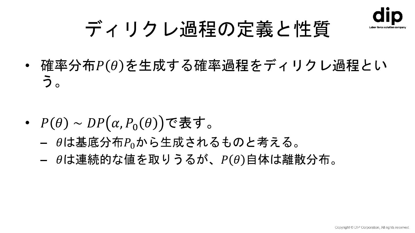𝐷𝑃 𝛼, 𝑃0 𝜃 で表す。 – 𝜃は基底分布𝑃0 から生成されるものと考える。 – 𝜃は連続的な値を取りうるが、𝑃 𝜃 自体は離散分布。