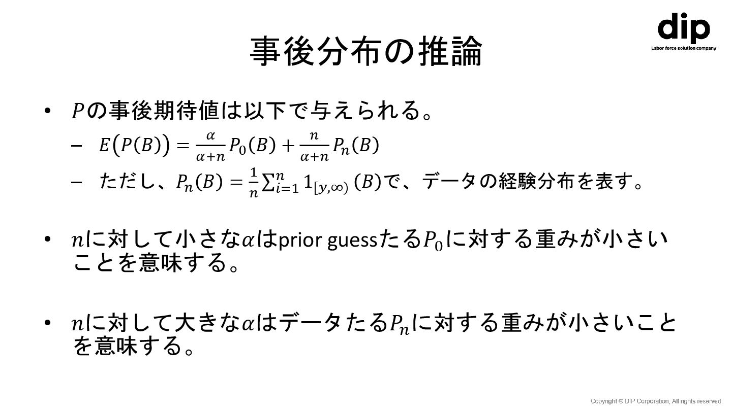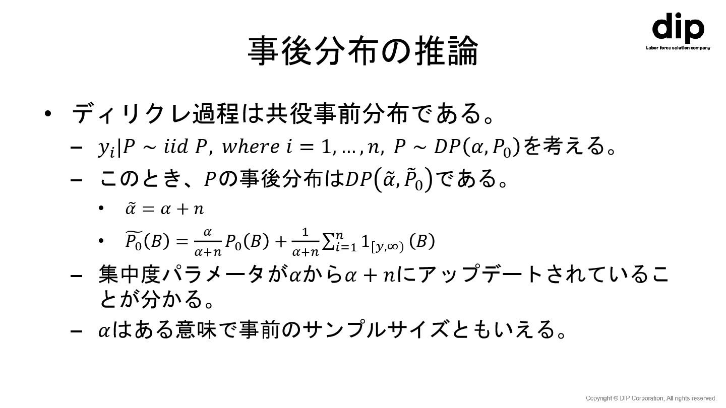 𝑖 = 1, … , 𝑛, 𝑃 ∼ 𝐷𝑃 𝛼, 𝑃0 を考える。 – このとき、𝑃の事後分布は𝐷𝑃 𝛼, ෨ 𝑃0 である。 • 𝛼 = 𝛼 + 𝑛 • ෪ 𝑃0 𝐵 = 𝛼 𝛼+𝑛 𝑃0 𝐵 + 1 𝛼+𝑛 σ 𝑖=1 𝑛 1[𝑦,∞) 𝐵 – 集中度パラメータが𝛼から𝛼 + 𝑛にアップデートされているこ とが分かる。 – 𝛼はある意味で事前のサンプルサイズともいえる。