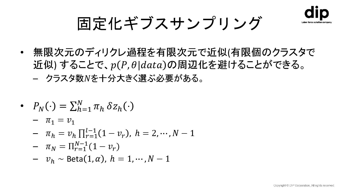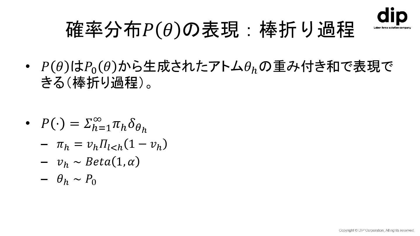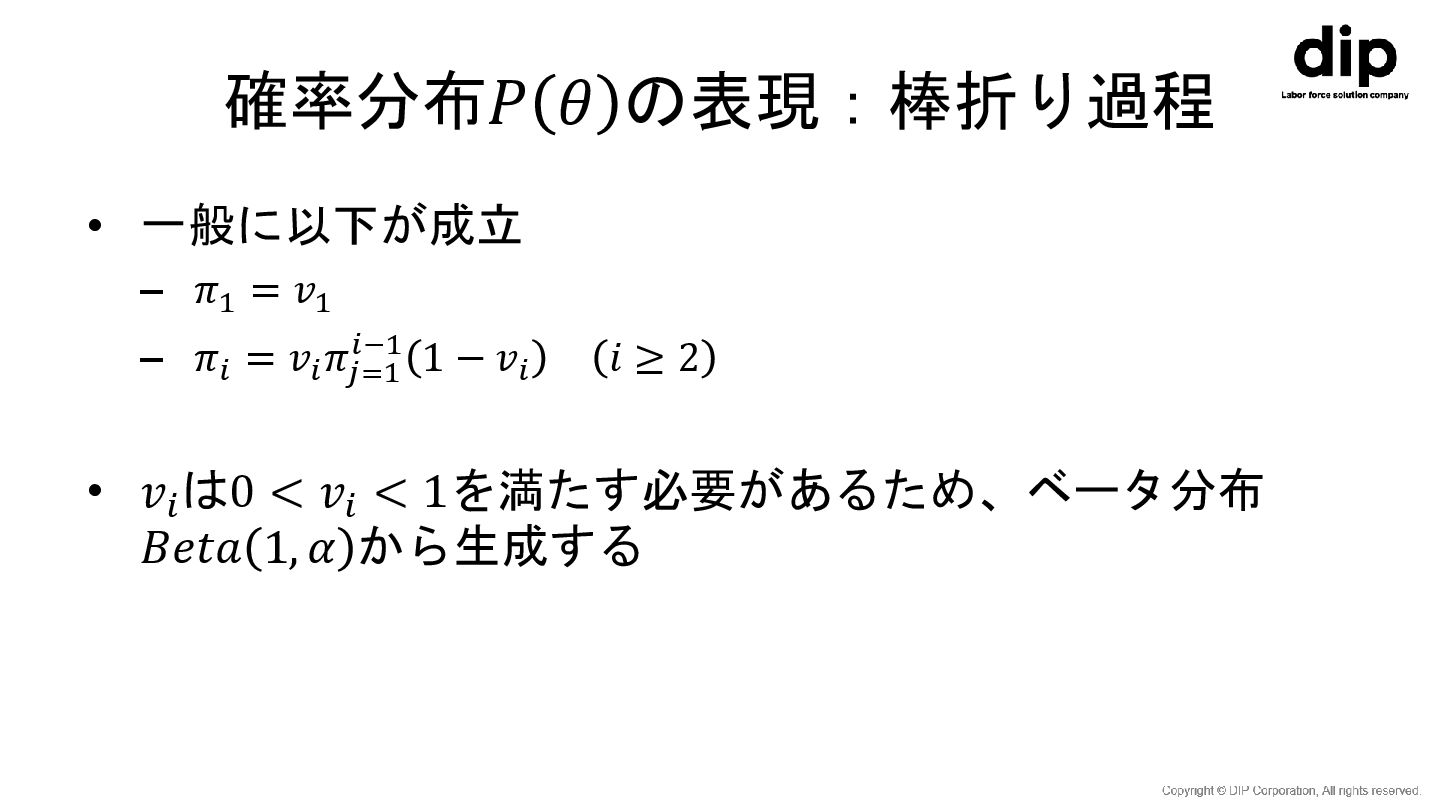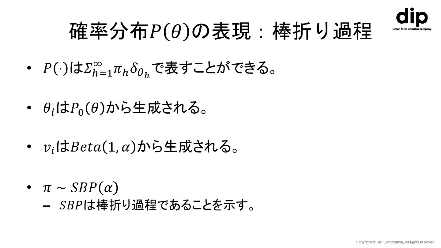 で表すことができる。 • 𝜃𝑖 は𝑃0 𝜃 から生成される。 • 𝑣𝑖 は𝐵𝑒𝑡𝑎 1, 𝛼 から生成される。 • 𝜋 ∼ 𝑆𝐵𝑃 𝛼 – 𝑆𝐵𝑃は棒折り過程であることを示す。