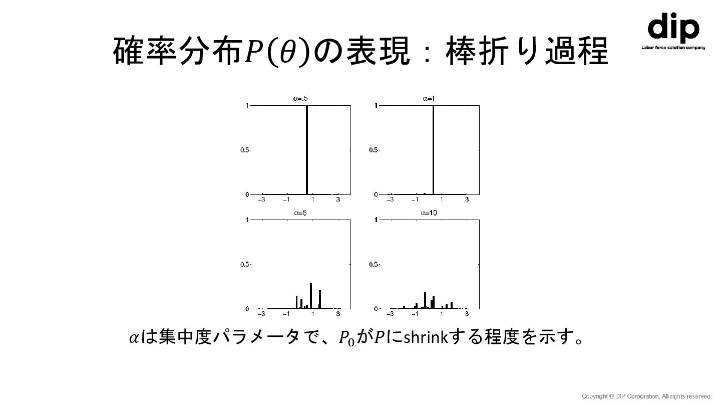 確率分布𝑃 𝜃 の表現:棒折り過程 𝛼は集中度パラメータで、𝑃0 が𝑃にshrinkする程度を示す。