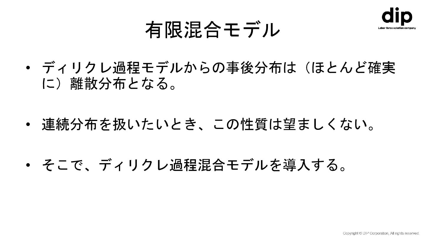 有限混合モデル • ディリクレ過程モデルからの事後分布は(ほとんど確実 に)離散分布となる。 • 連続分布を扱いたいとき、この性質は望ましくない。 • そこで、ディリクレ過程混合モデルを導入する。