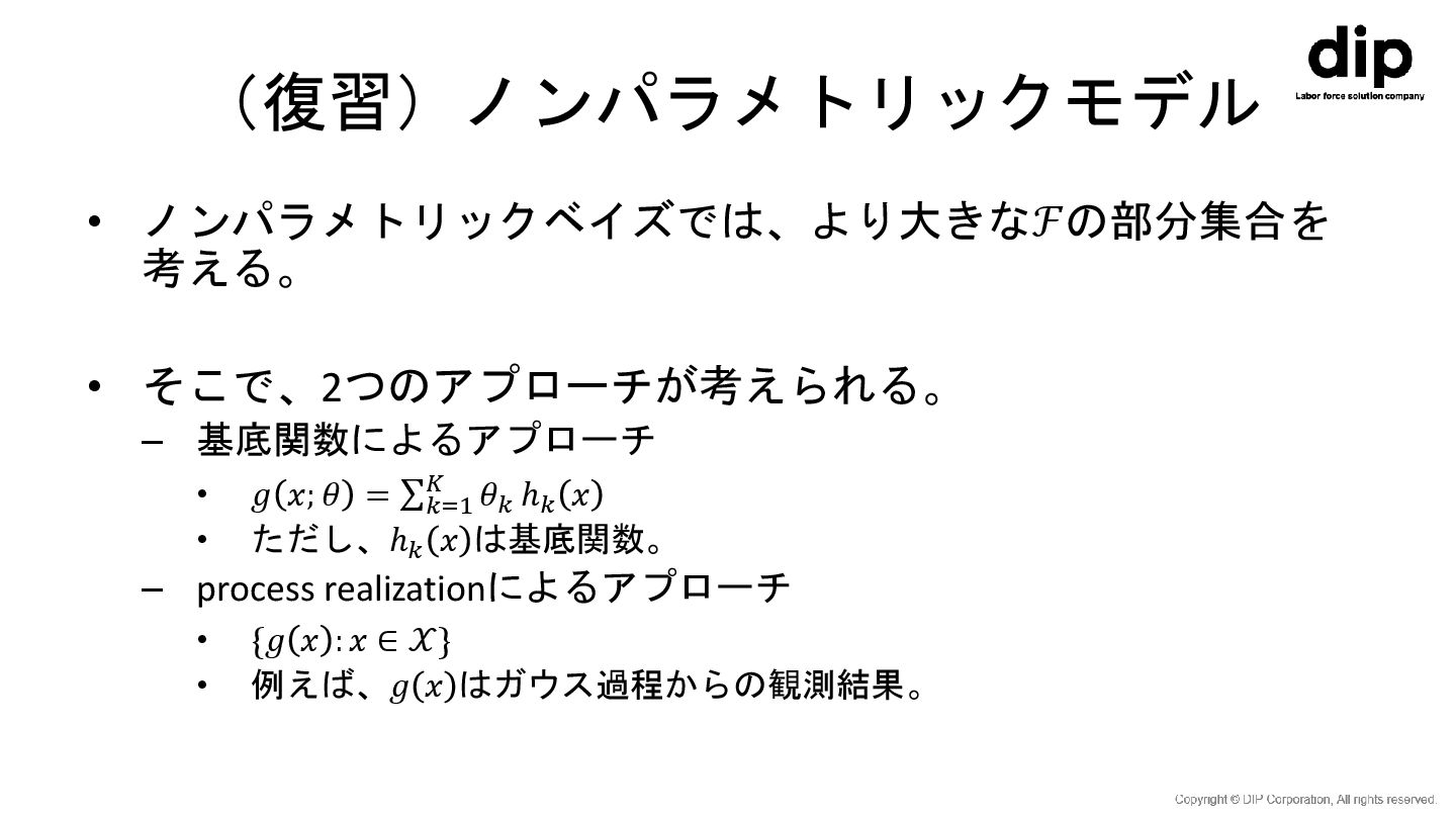 (復習)ノンパラメトリックモデル • ノンパラメトリックベイズでは、より大きなℱの部分集合を 考える。 • そこで、2つのアプローチが考えられる。 – 基底関数によるアプローチ • 𝑔