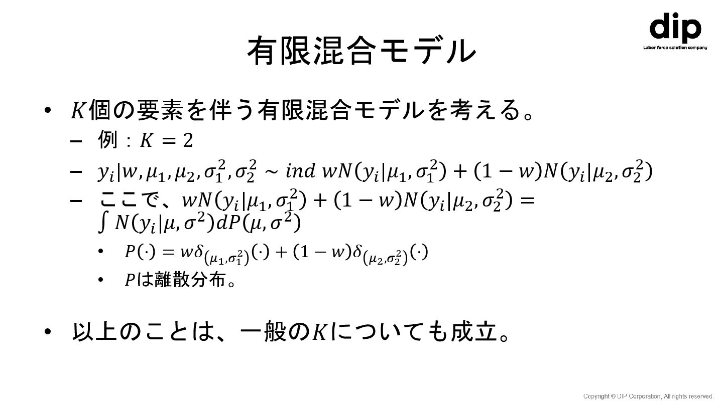𝜇1 , 𝜇2 , 𝜎1 2, 𝜎2 2 ∼ 𝑖𝑛𝑑 𝑤𝑁 𝑦𝑖 |𝜇1 , 𝜎1 2 + 1 − 𝑤 𝑁 𝑦𝑖 |𝜇2 , 𝜎2 2 – ここで、𝑤𝑁 𝑦𝑖 |𝜇1 , 𝜎1 2 + 1 − 𝑤 𝑁 𝑦𝑖 |𝜇2 , 𝜎2 2 = ∫ 𝑁 𝑦𝑖 |𝜇, 𝜎2 𝑑𝑃 𝜇, 𝜎2 • 𝑃 ⋅ = 𝑤𝛿 𝜇1,𝜎1 2 ⋅ + 1 − 𝑤 𝛿 𝜇2,𝜎2 2 ⋅ • 𝑃は離散分布。 • 以上のことは、一般の𝐾についても成立。