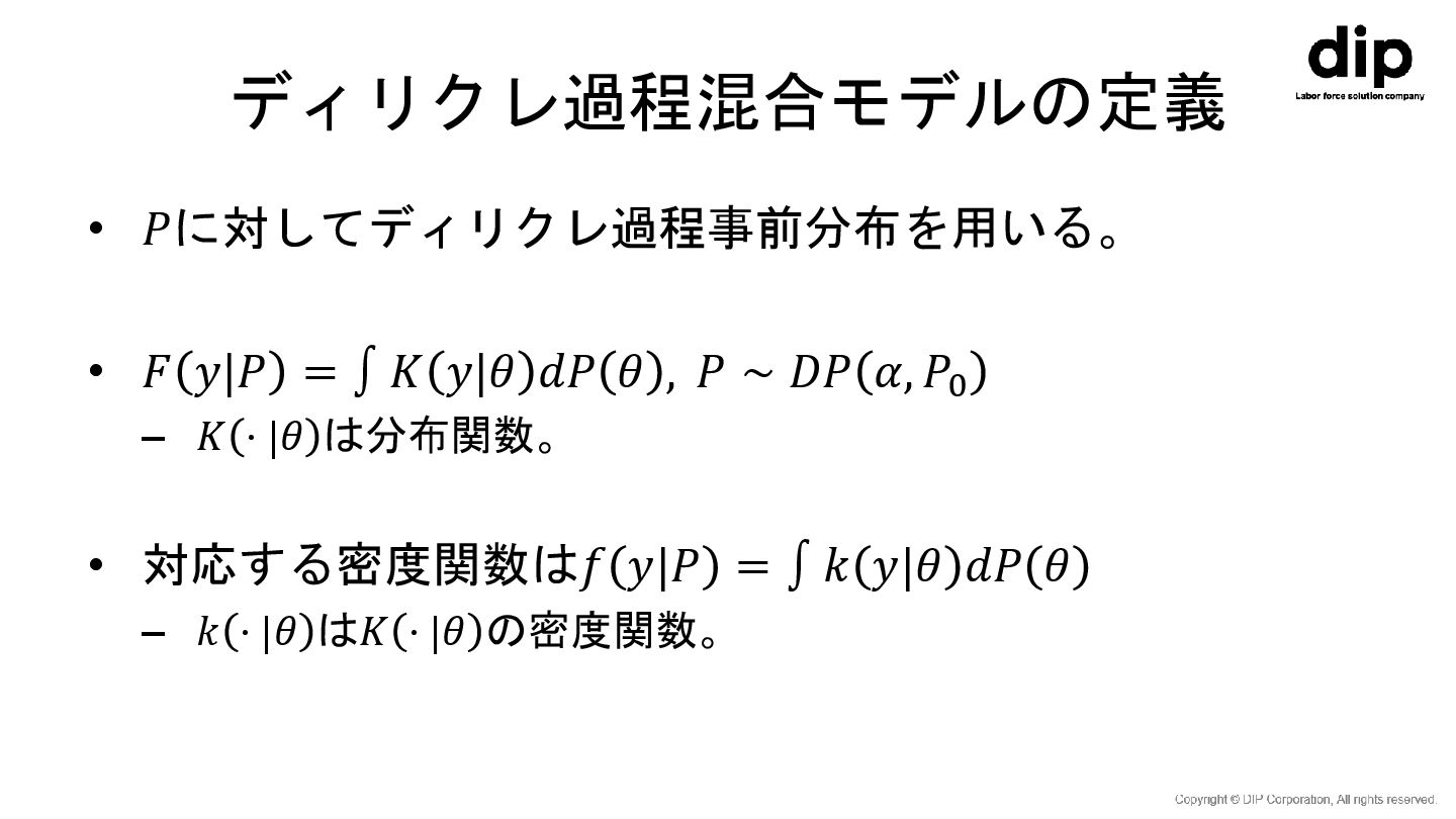 𝑑𝑃 𝜃 , 𝑃 ∼ 𝐷𝑃 𝛼, 𝑃0 – 𝐾 ⋅ |𝜃 は分布関数。 • 対応する密度関数は𝑓 𝑦|𝑃 = ∫ 𝑘 𝑦|𝜃 𝑑𝑃 𝜃 – 𝑘 ⋅ |𝜃 は𝐾 ⋅ |𝜃 の密度関数。