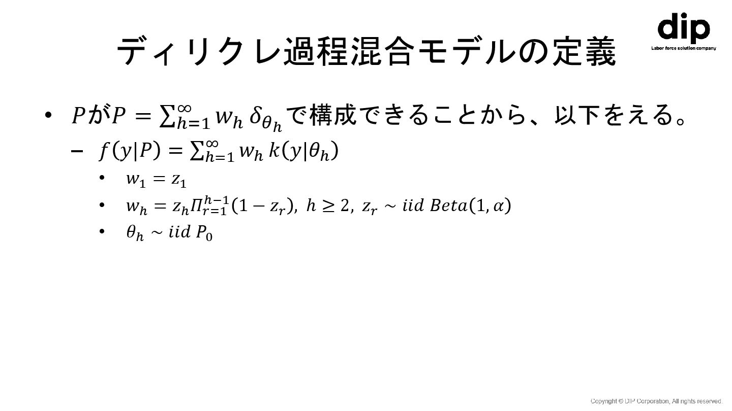 きる(棒折り過程)。 • 𝑃 ⋅ = 𝛴ℎ=1 ∞ 𝜋ℎ 𝛿𝜃ℎ – 𝜋ℎ = 𝑣ℎ 𝛱𝑙<ℎ 1 − 𝑣ℎ – 𝑣ℎ ∼ 𝐵𝑒𝑡𝑎 1, 𝛼 – 𝜃ℎ ∼ 𝑃0