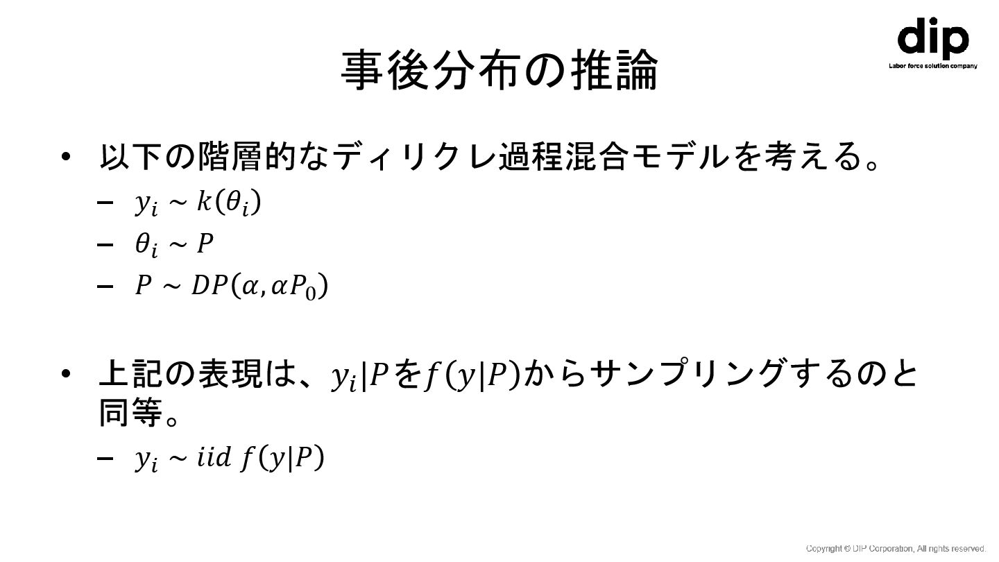 ∼ 𝑃 – 𝑃 ∼ 𝐷𝑃 𝛼, 𝛼𝑃0 • 上記の表現は、𝑦𝑖 |𝑃を𝑓 𝑦|𝑃 からサンプリングするのと 同等。 – 𝑦𝑖 ∼ 𝑖𝑖𝑑 𝑓 𝑦|𝑃
