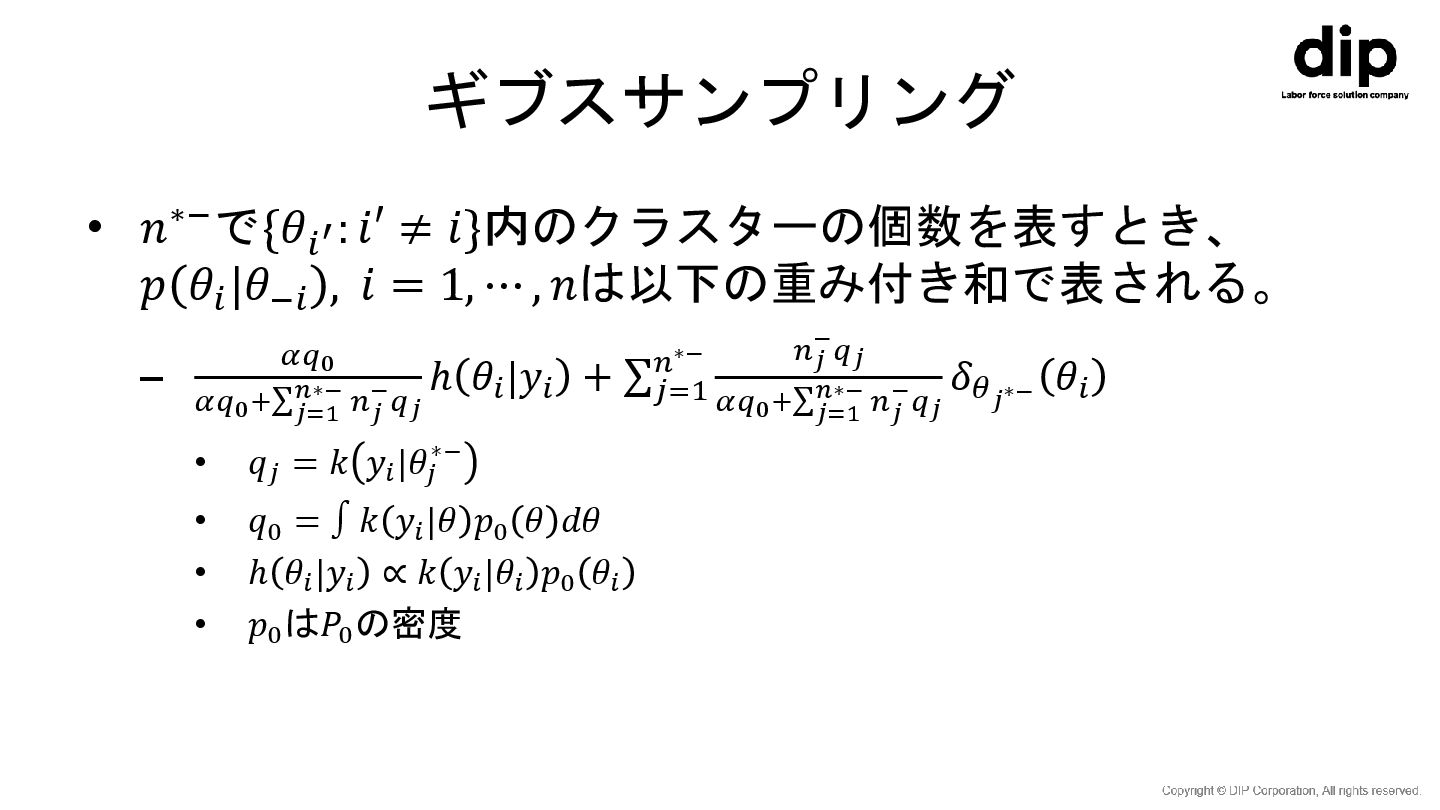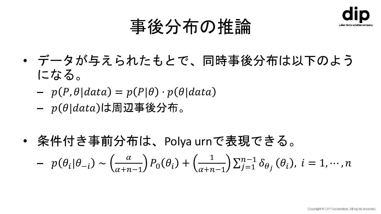 𝑃|𝜃 ⋅ 𝑝 𝜃|𝑑𝑎𝑡𝑎 – 𝑝 𝜃|𝑑𝑎𝑡𝑎 は周辺事後分布。 • 条件付き事前分布は、Polya urnで表現できる。 – 𝑝 𝜃𝑖 |𝜃−𝑖 ∼ 𝛼 𝛼+𝑛−1 𝑃0 𝜃𝑖 + 1 𝛼+𝑛−1 σ 𝑗=1 𝑛−1 𝛿𝜃𝑗 𝜃𝑖 , 𝑖 = 1, ⋯ , 𝑛