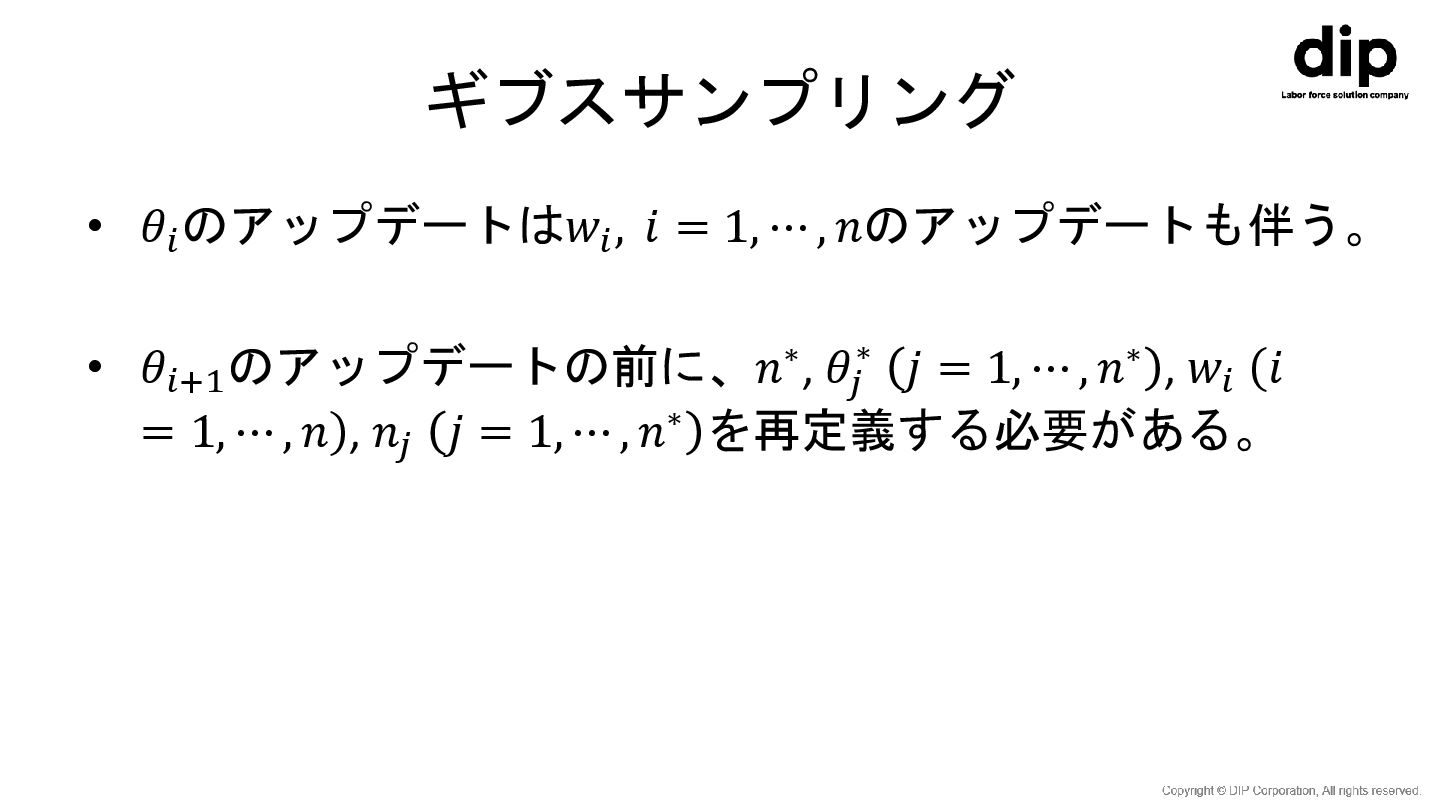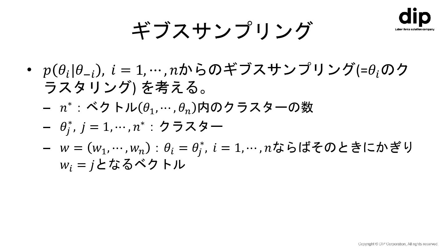 , 𝑛からのギブスサンプリング(=𝜃𝑖 のク ラスタリング) を考える。 – 𝑛∗:ベクトル 𝜃1 , ⋯ , 𝜃𝑛 内のクラスターの数 – 𝜃𝑗 ∗, 𝑗 = 1, ⋯ , 𝑛∗:クラスター – 𝑤 = 𝑤1 , ⋯ , 𝑤𝑛 :𝜃𝑖 = 𝜃𝑗 ∗, 𝑖 = 1, ⋯ , 𝑛ならばそのときにかぎり 𝑤𝑖 = 𝑗となるベクトル