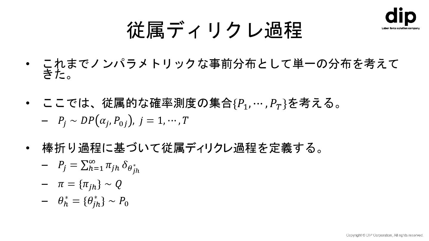 }を考える。 – 𝑃𝑗 ∼ 𝐷𝑃 𝛼𝑗 , 𝑃0𝑗 , 𝑗 = 1, ⋯ , 𝑇 • 棒折り過程に基づいて従属ディリクレ過程を定義する。 – 𝑃𝑗 = σℎ=1 ∞ 𝜋𝑗ℎ 𝛿𝜃𝑗ℎ ∗ – 𝜋 = {𝜋𝑗ℎ } ∼ 𝑄 – 𝜃ℎ ∗ = {𝜃𝑗ℎ ∗ } ∼ 𝑃0