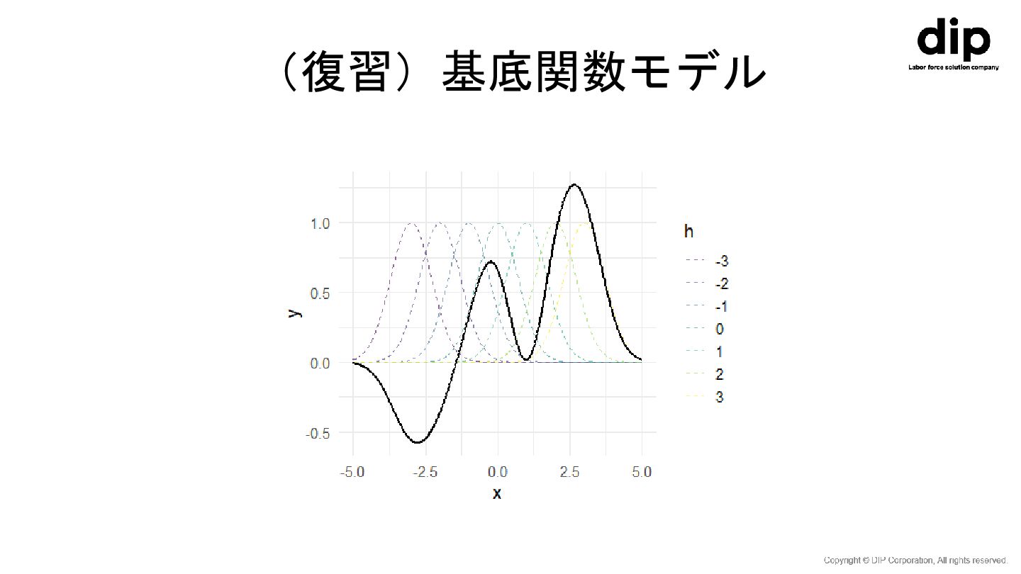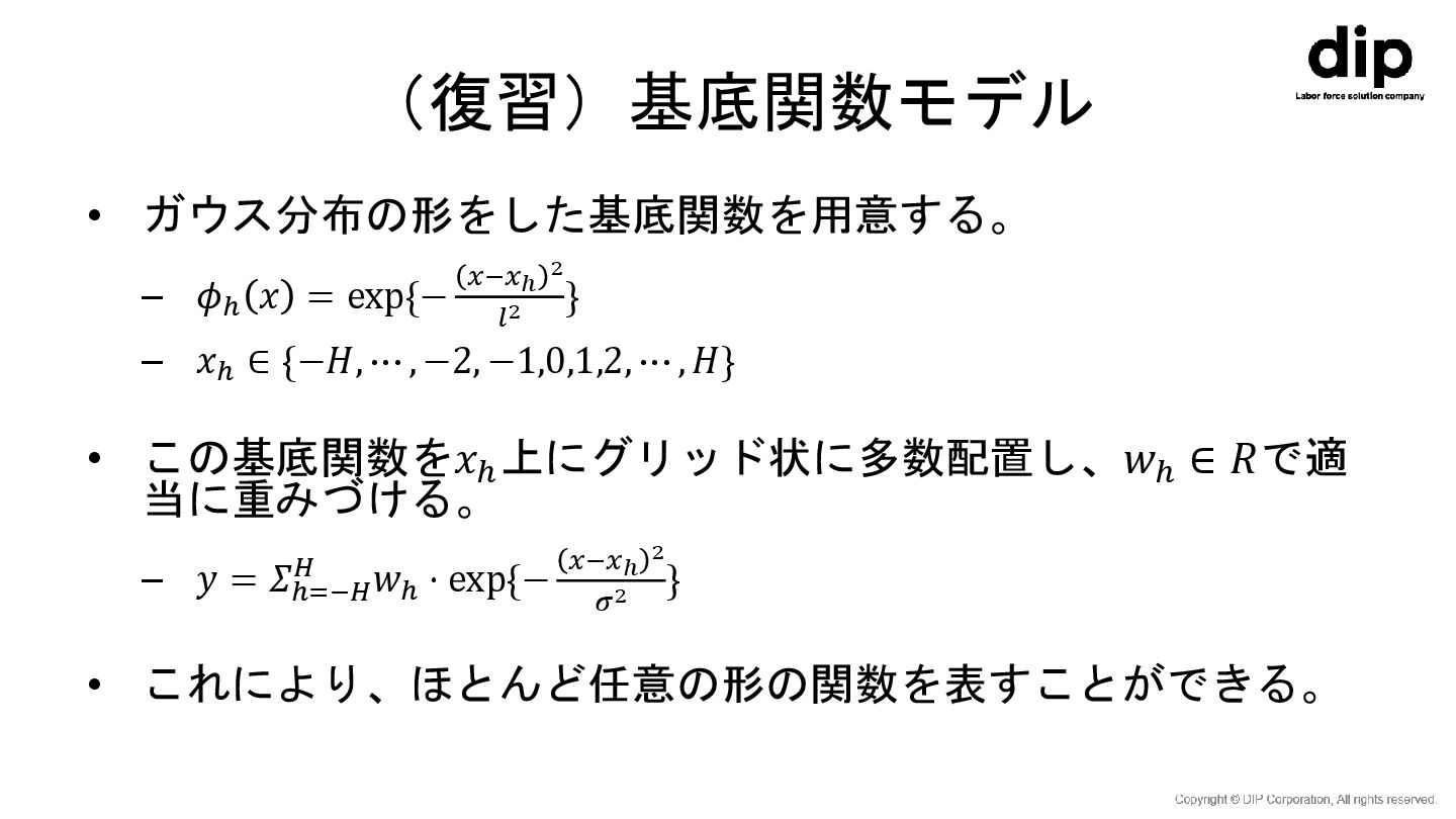 𝑙2 } – 𝑥ℎ ∈ {−𝐻, ⋯ , −2, −1,0,1,2, ⋯ , 𝐻} • この基底関数を𝑥ℎ 上にグリッド状に多数配置し、𝑤ℎ ∈ 𝑅で適 当に重みづける。 – 𝑦 = 𝛴ℎ=−𝐻 𝐻 𝑤ℎ ⋅ exp{− 𝑥−𝑥ℎ 2 𝜎2 } • これにより、ほとんど任意の形の関数を表すことができる。