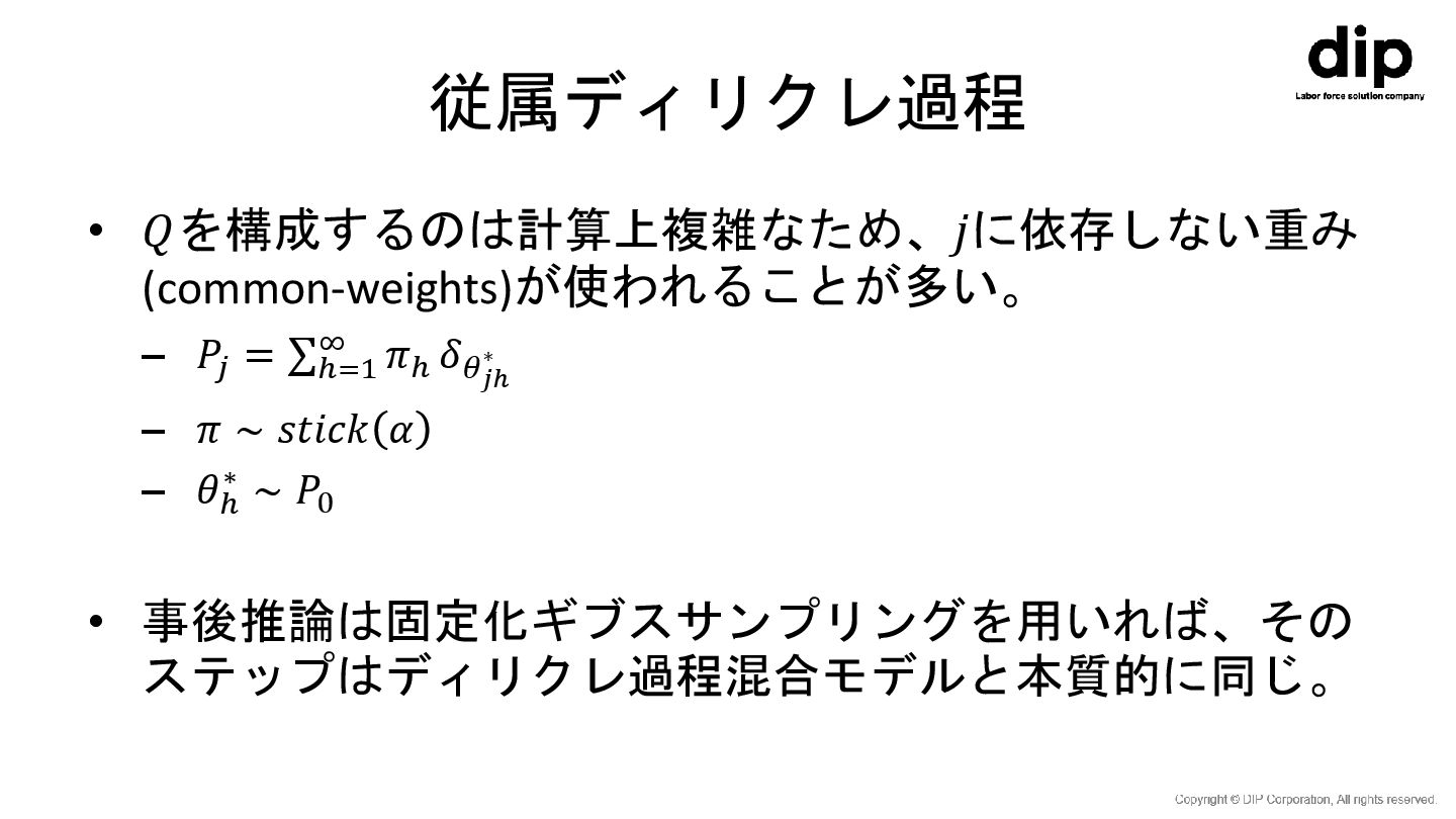 従属ディリクレ過程 • 𝑄を構成するのは計算上複雑なため、𝑗に依存しない重み (common-weights)が使われることが多い。 – 𝑃𝑗 = σℎ=1 ∞ 𝜋ℎ