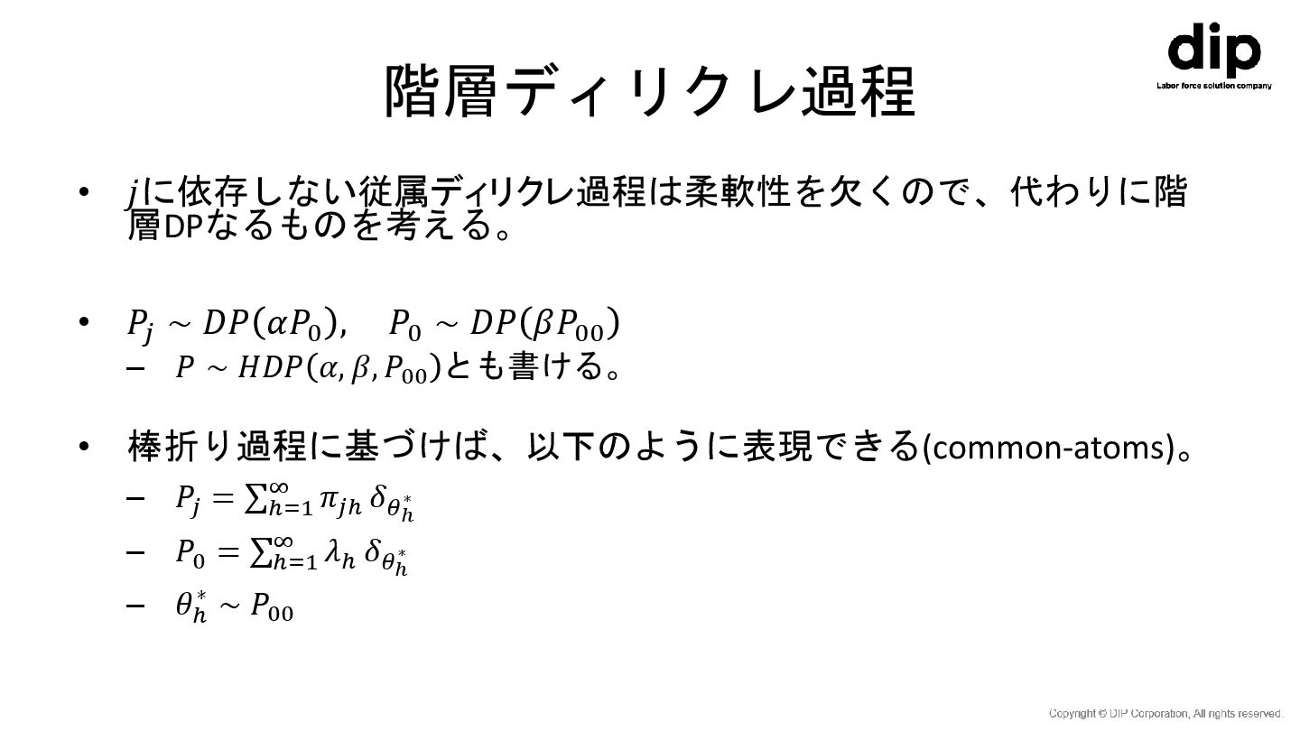 𝑃0 ∼ 𝐷𝑃 𝛽𝑃00 – 𝑃 ∼ 𝐻𝐷𝑃 𝛼, 𝛽, 𝑃00 とも書ける。 • 棒折り過程に基づけば、以下のように表現できる(common-atoms)。 – 𝑃𝑗 = σℎ=1 ∞ 𝜋𝑗ℎ 𝛿𝜃ℎ ∗ – 𝑃0 = σℎ=1 ∞ 𝜆ℎ 𝛿𝜃ℎ ∗ – 𝜃ℎ ∗ ∼ 𝑃00