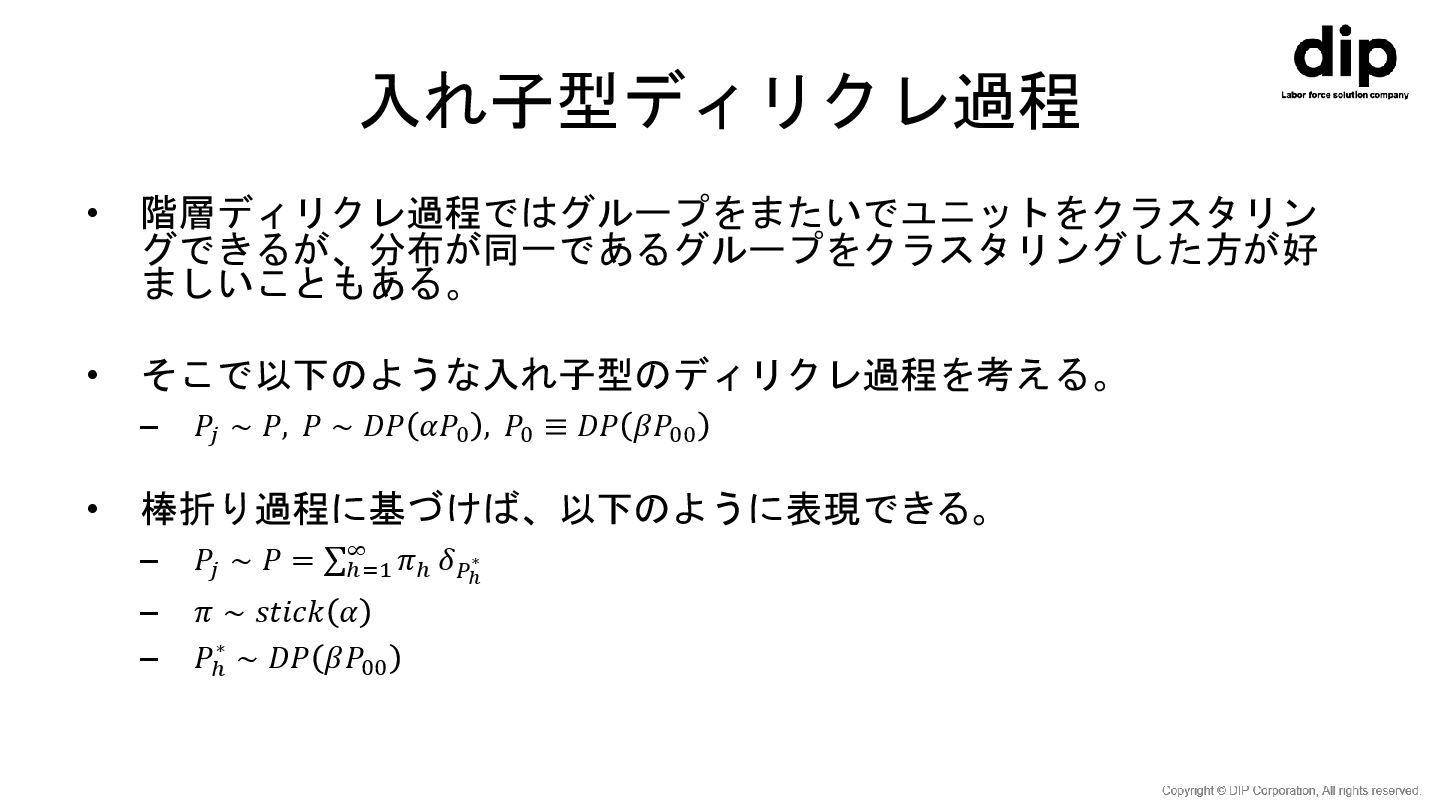入れ子型ディリクレ過程 • 階層ディリクレ過程ではグループをまたいでユニットをクラスタリン グできるが、分布が同一であるグループをクラスタリングした方が好 ましいこともある。 • そこで以下のような入れ子型のディリクレ過程を考える。 – 𝑃𝑗 ∼