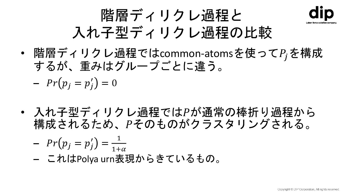 階層ディリクレ過程と 入れ子型ディリクレ過程の比較 • 階層ディリクレ過程ではcommon-atomsを使って𝑃𝑗 を構成 するが、重みはグループごとに違う。 – 𝑃𝑟 𝑝𝑗 =