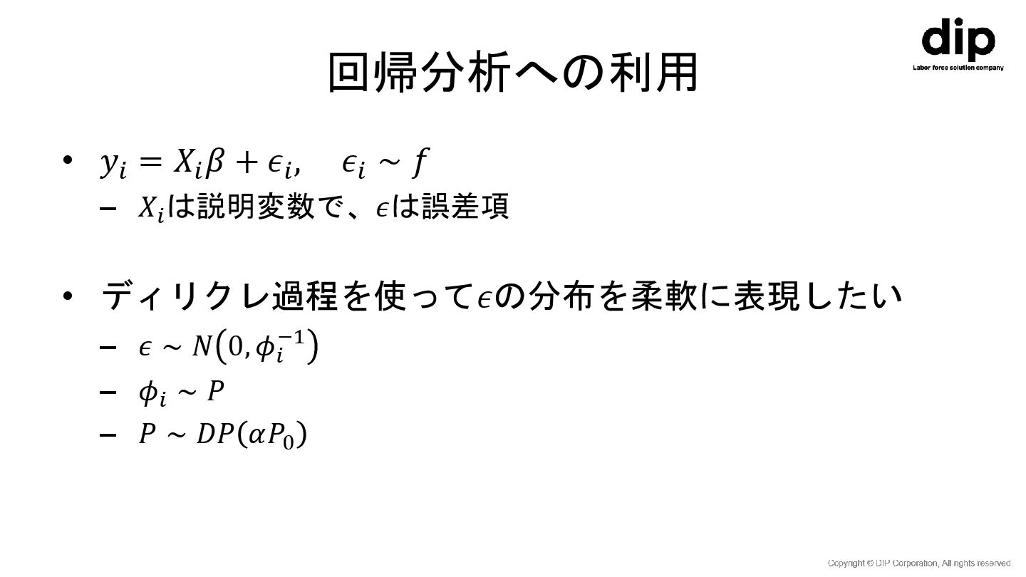 ∼ 𝑓 – 𝑋𝑖 は説明変数で、𝜖は誤差項 • ディリクレ過程を使って𝜖の分布を柔軟に表現したい – 𝜖 ∼ 𝑁 0, 𝜙𝑖 −1 – 𝜙𝑖 ∼ 𝑃 – 𝑃 ∼ 𝐷𝑃 𝛼𝑃0
