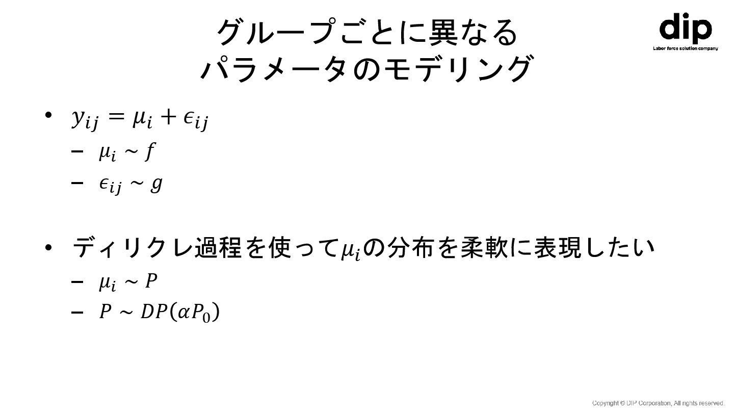 ∼ 𝑓 – 𝜖𝑖𝑗 ∼ 𝑔 • ディリクレ過程を使って𝜇𝑖 の分布を柔軟に表現したい – 𝜇𝑖 ∼ 𝑃 – 𝑃 ∼ 𝐷𝑃 𝛼𝑃0