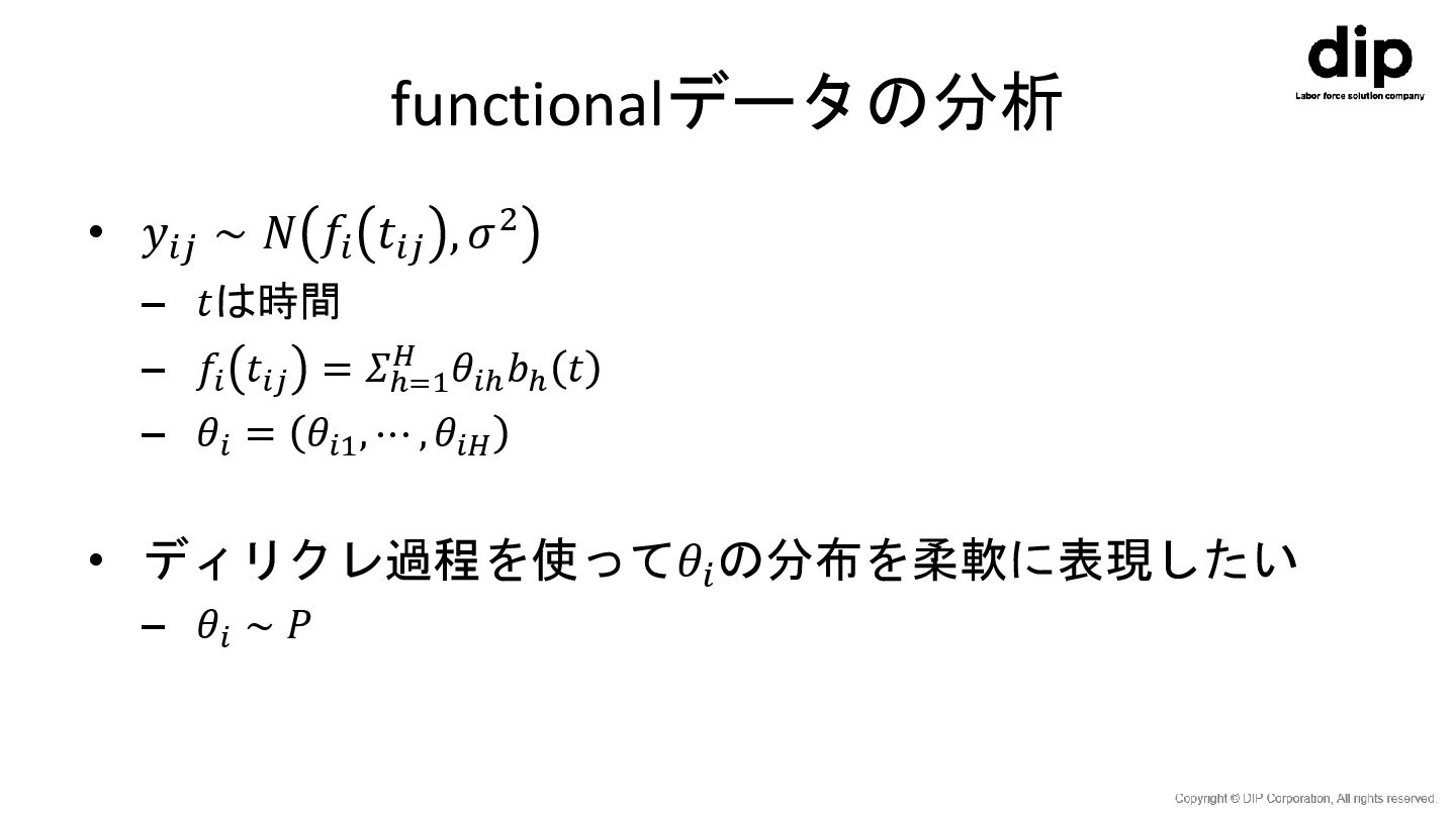 𝑡は時間 – 𝑓𝑖 𝑡𝑖𝑗 = 𝛴ℎ=1 𝐻 𝜃𝑖ℎ 𝑏ℎ 𝑡 – 𝜃𝑖 = 𝜃𝑖1 , ⋯ , 𝜃𝑖𝐻 • ディリクレ過程を使って𝜃𝑖 の分布を柔軟に表現したい – 𝜃𝑖 ∼ 𝑃